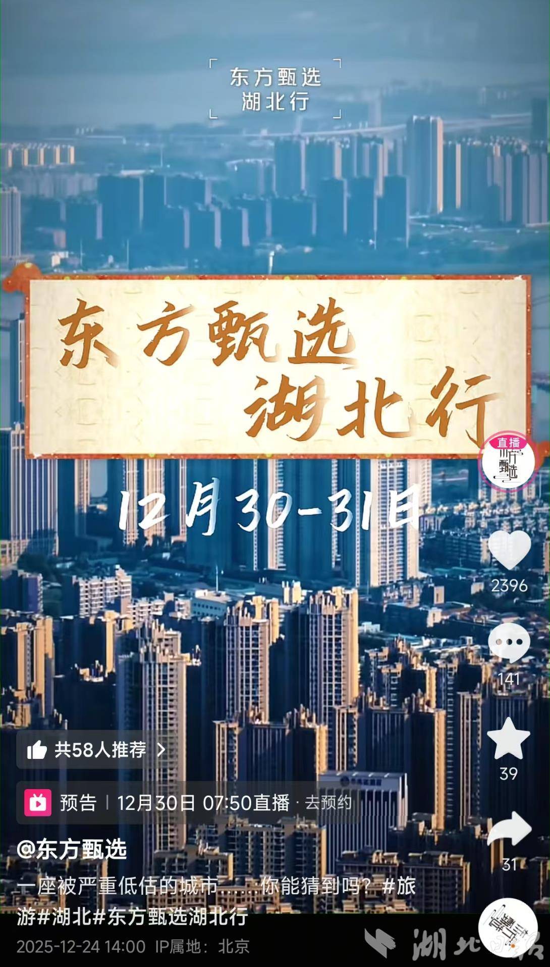 12月30-31日,东方甄选直接把直播间“空降”到黄鹤楼前