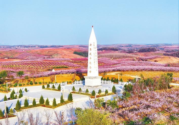 桃园中央,19.32米高的新集战斗纪念碑巍然肃穆。1932年冬季,这里发生过一场被徐向前元帅感慨“险些全军覆没”的战斗,长眠着近千名红军战士。