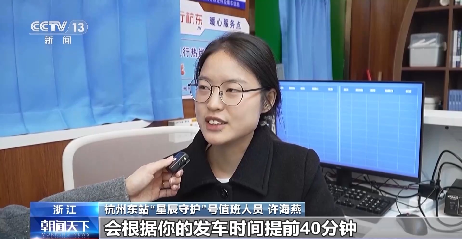 杭州东站“星辰守护”号值班人员 许海燕:这边有提醒系统,对应的座位后面会有一个小喇叭,它会根据发车时间提前40分钟,提醒旅客去乘车。