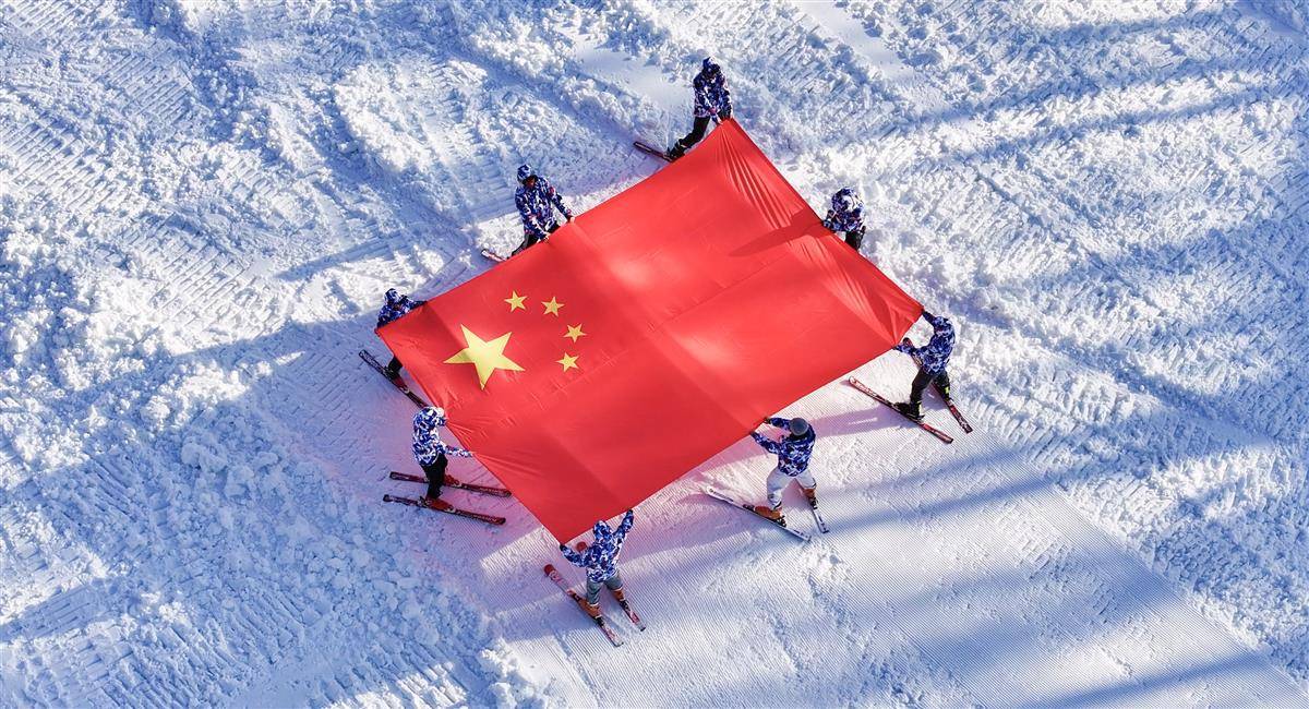 12月28日,位于襄阳市保康县的横冲国际滑雪场开板,千余名游客畅享冰雪乐趣。图为滑雪爱好者手持巨大国旗滑行。(湖北日报全媒记者 赵怡然 摄)
