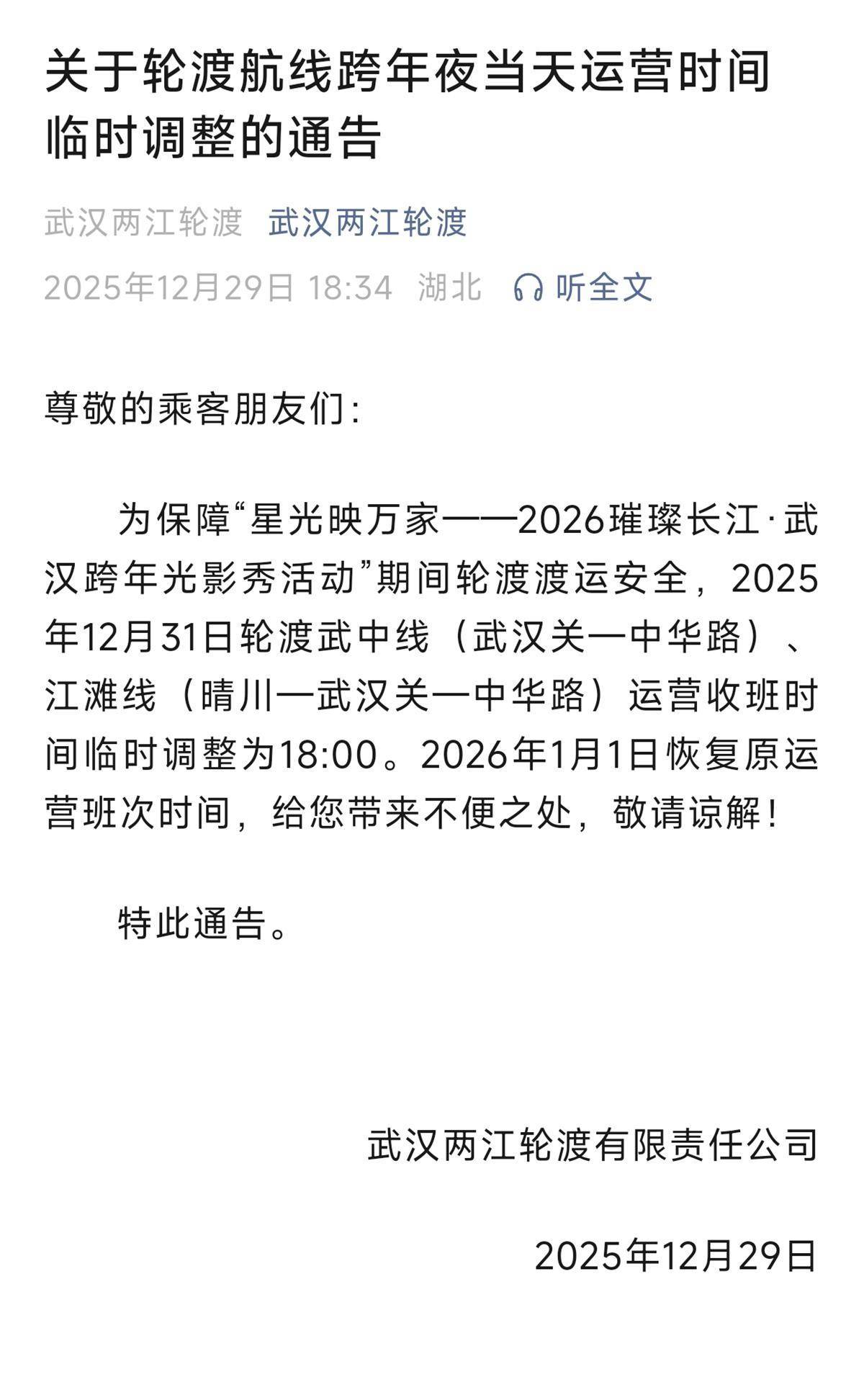 武汉两江轮渡公告原文