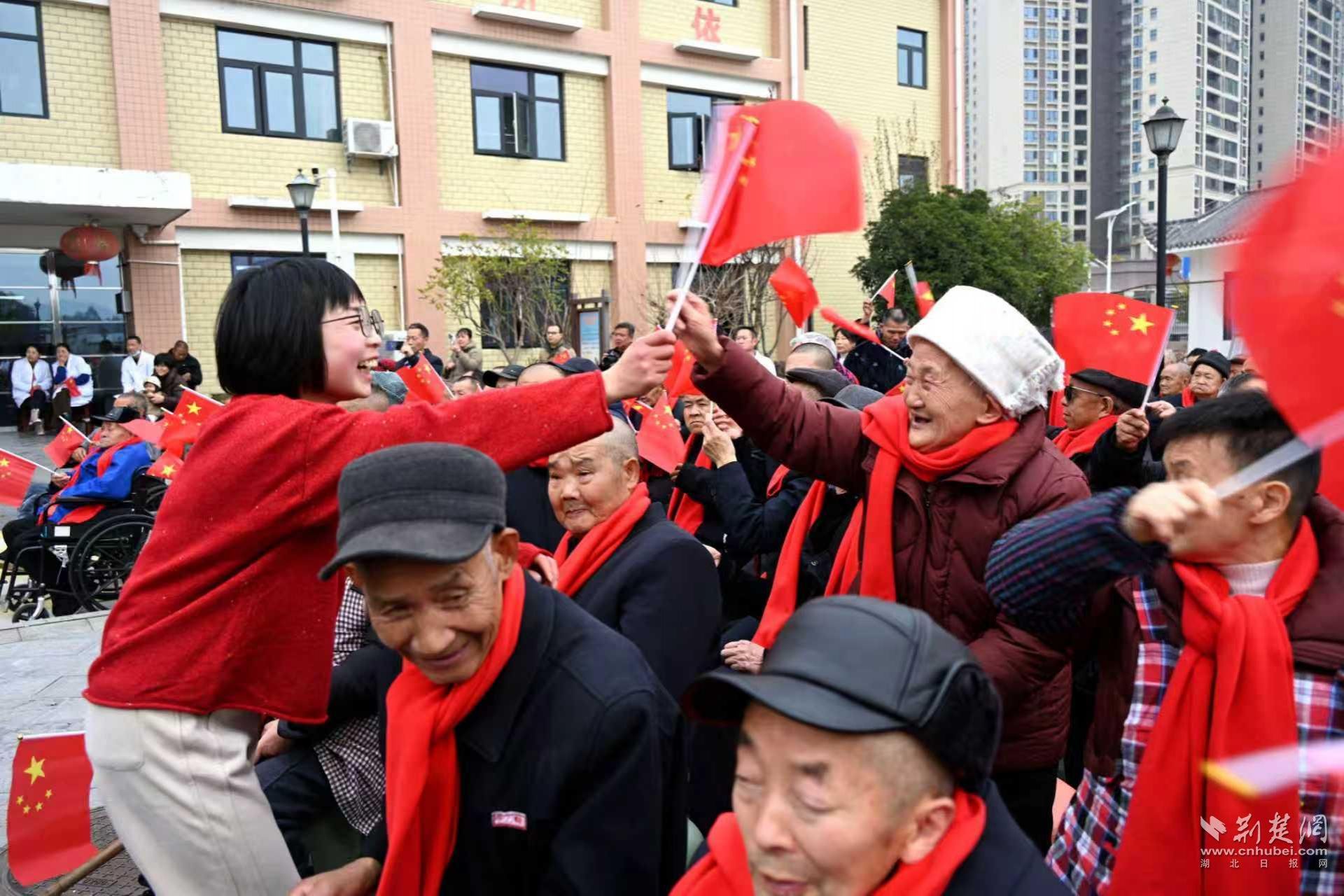 活动现场,养老服务中心人员带来的欢快民族舞《哈格砸》将活动推向高潮。老人们围着红围巾,挥舞着小红旗,沉浸在欢乐的海洋,脸上洋溢着幸福的笑容。