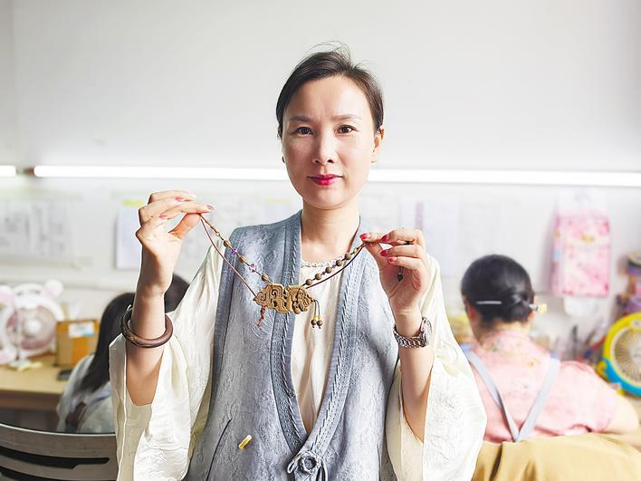 聂恋展示合香胸牌。 (湖北日报全媒记者 方桐 摄)