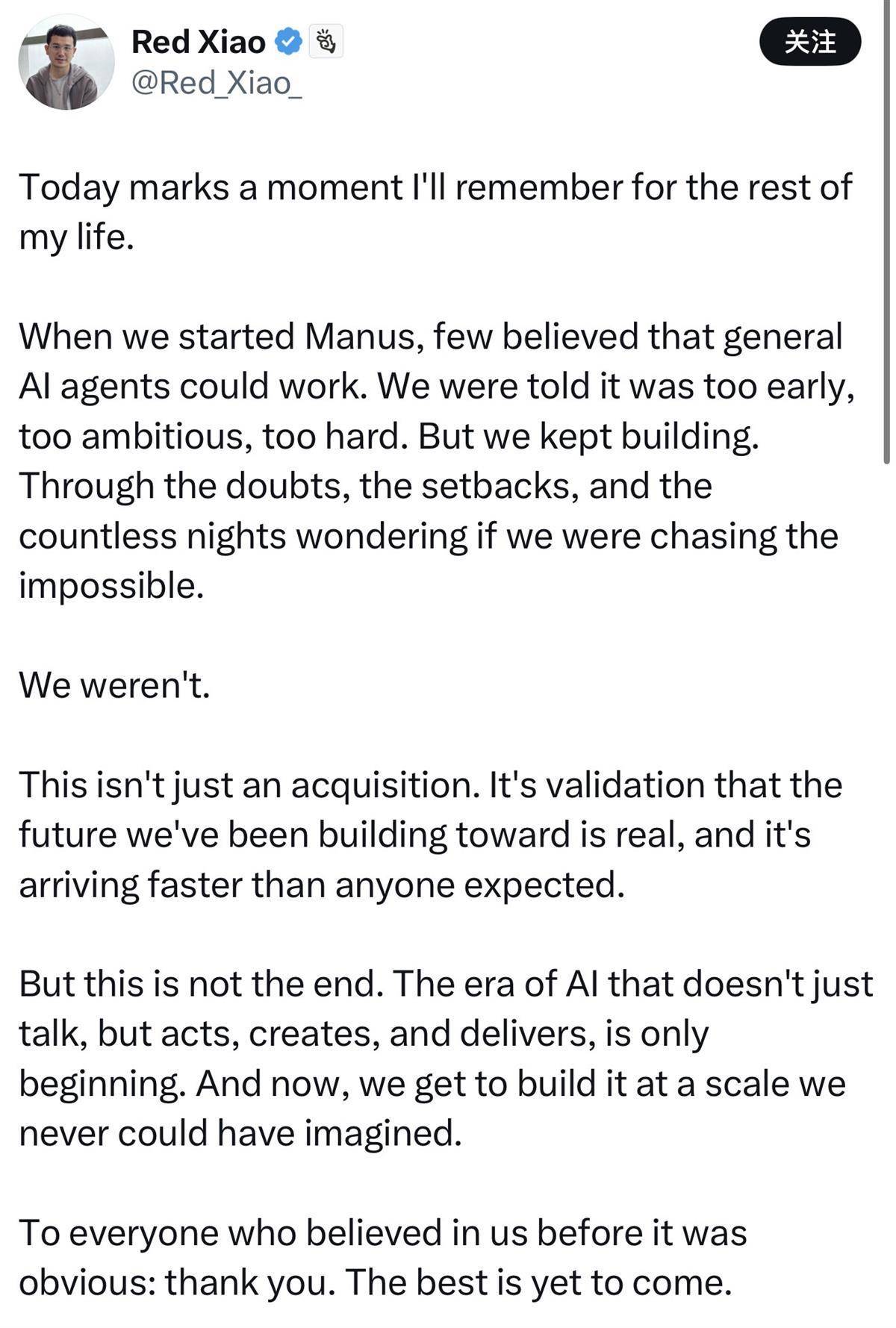 肖弘用“终生难忘的时刻”形容这次收购。他说,团队创立Manus时,很少有人相信通用型人工智能体能够成功。人们质疑这项技术处于早期,Manus的目标太远、难度太大。“但我们坚持不懈地努力,克服了重重疑虑和挫折,以及对自身‘是否在追逐不可能完成的事’的怀疑。”