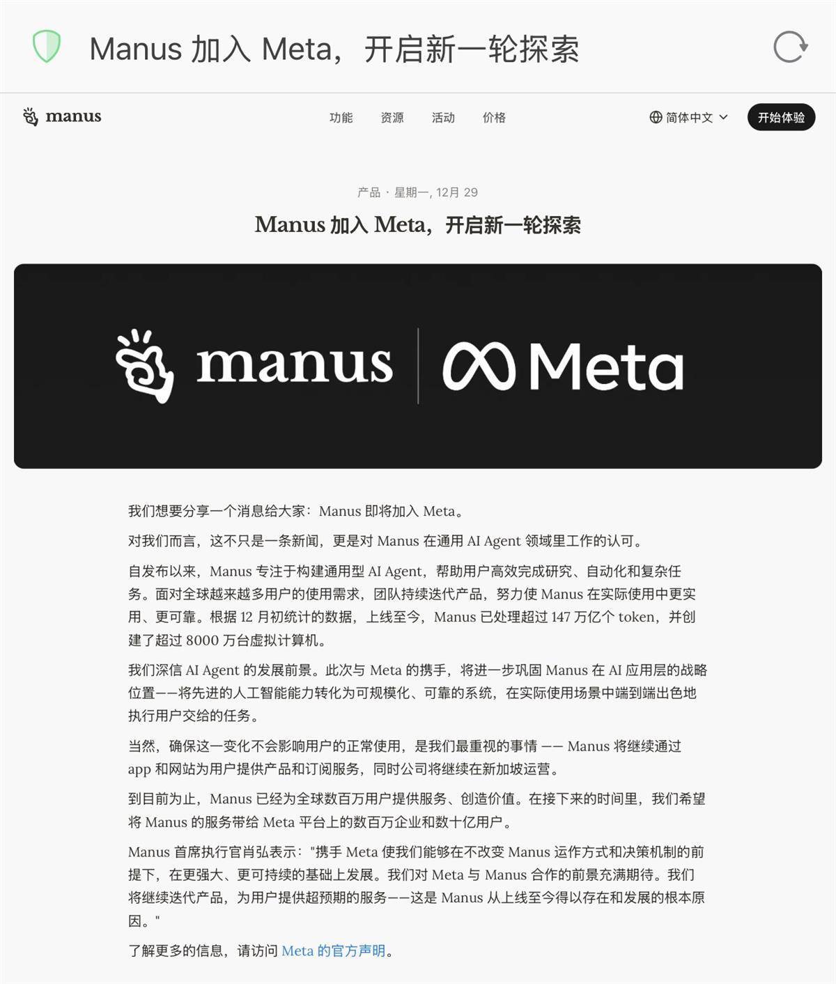 Meta公司官方声明说,Manus建立了领先的通用型人工智能体,可以独立执行市场研究、编码和数据分析等复杂任务。上线不到一年时间里,Manus已经处理执行超过147万亿个用户任务,并创建了超过8000万台虚拟计算机,服务了全球数百万用户和企业。12月中旬,Manus宣布年度经常性收入(ARR)已突破1亿美元。