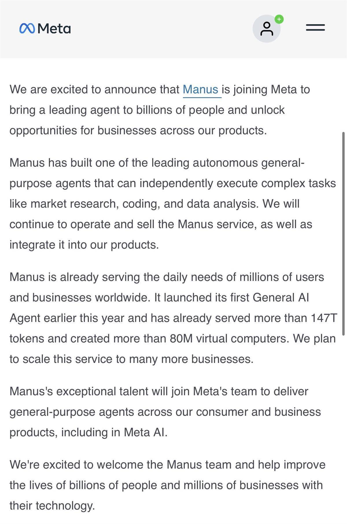 Meta公司官方声明说,Manus建立了领先的通用型人工智能体,可以独立执行市场研究、编码和数据分析等复杂任务。上线不到一年时间里,Manus已经处理执行超过147万亿个用户任务,并创建了超过8000万台虚拟计算机,服务了全球数百万用户和企业。12月中旬,Manus宣布年度经常性收入(ARR)已突破1亿美元。