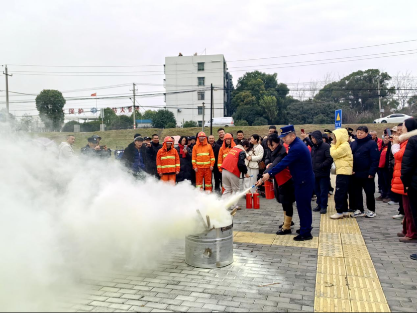 培训现场,消防宣讲员重点演示了灭火器的正确使用步骤——提、拔、握、压,以及室外消防栓水带的快速连接方法。参训物业人员认真聆听,并随后进行实操练习。