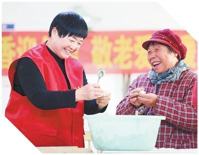 山东省临沂市郯城县郯城街道团结社区,党员志愿者和老年人一起包饺子、拉家常。