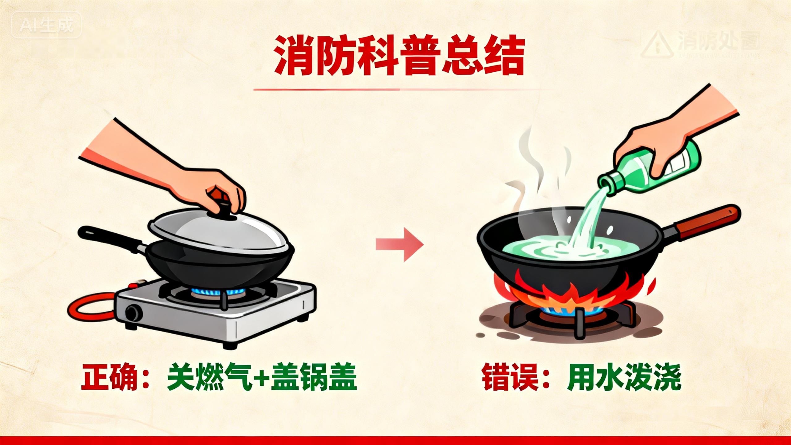 切勿用水灭火!水与高温热油相遇会迅速汽化,产生“炸锅”效应,油火随水蒸气飞溅,瞬间扩大燃烧范围,极易造成人员严重烧伤和火灾蔓延。此外,试图将起火的油锅移出室外、或使用面粉、淀粉等粉末状物品灭火,同样非常危险,可能引发更大灾难。