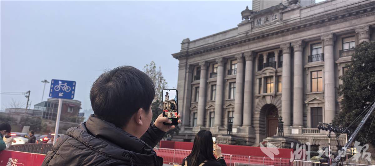 傍晚6点,江汉关墙体忽然亮起。“2026”“武汉”“共祝愿祖国好”等字样,配合流动的动画,在百年立面上交替浮现。