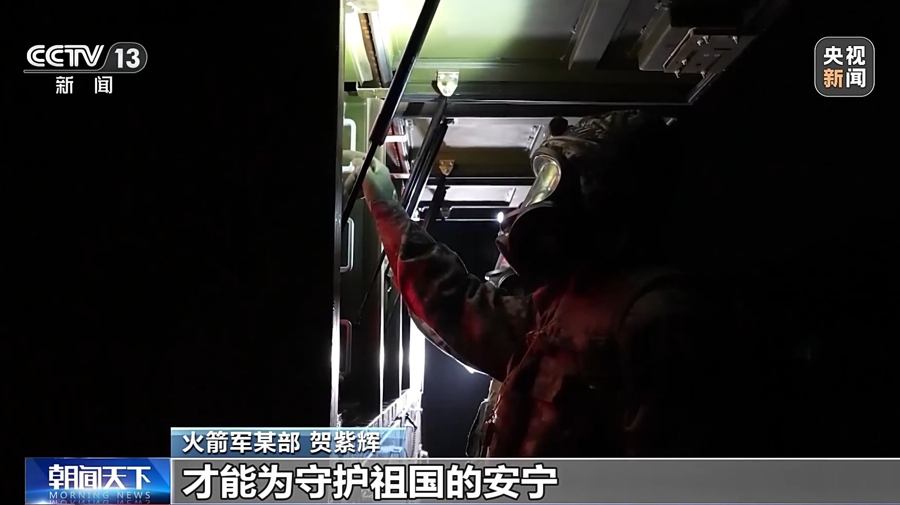 火箭军某部 崔道虎:我们导弹工程兵的工作,就是高强度、高风险、高分散。这种抢工期、连轴转的高强度作业,对我们来说就是家常便饭。我们虽然上不了发射场,见不到、摸不着导弹,却能亲手托举它们腾飞九天。