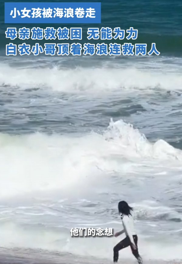 海浪如巨兽般扑向岸边,瞬间吞没了蹲在沙滩玩耍的小女孩。母亲发疯般冲进海里,却被更大的浪头打翻。绝望之际,一道白色身影毫不犹豫地三次冲进怒涛。