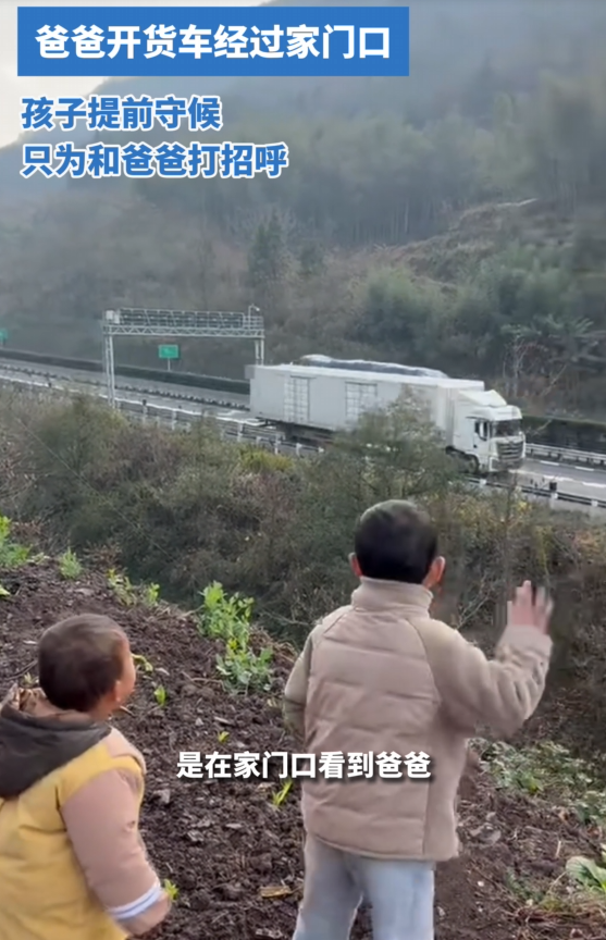 高速路天桥上,两个小小的身影在翘首以盼。一辆大卡车从远方驶来,孩子们兴奋地跳起来挥手。卡车经过桥下时,清晰地发出两声鸣笛,双闪灯轻轻闪烁。