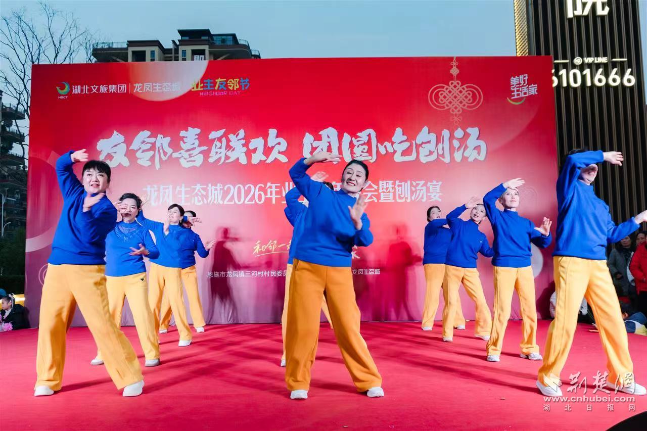 荆楚网(湖北日报网)讯(通讯员覃科峰)台上表演的是邻居,台下鼓掌的是家人。12月27日,恩施市龙凤生态城2026年业主新年晚会暨刨汤宴在恩施壹号院小区热闹举行。现场约二千名业主齐聚一堂,共享连续第三年举办的“杀年猪、吃刨汤”年味盛宴。