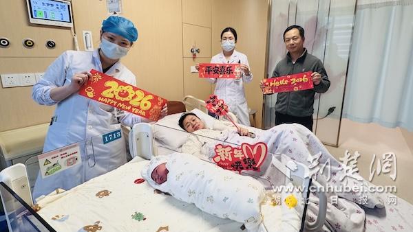 荆楚网(湖北日报网)讯(通讯员 张璟祎)新年钟声刚刚敲响,生命之喜如约而至。2026年1月1日00时02分,一声响亮的啼哭在武汉市妇幼保健院家庭化产房里响起,一个体重3450克的健康男婴成为了这里的新年第一位宝宝。