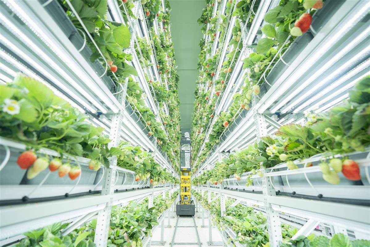 光谷花山的植物方舟草莓基地,200平方米的草莓垂直种植标准间,工作人员在8层立体栽培架间穿梭采摘。