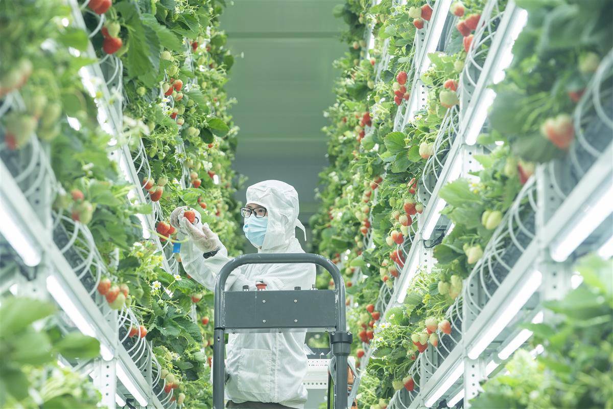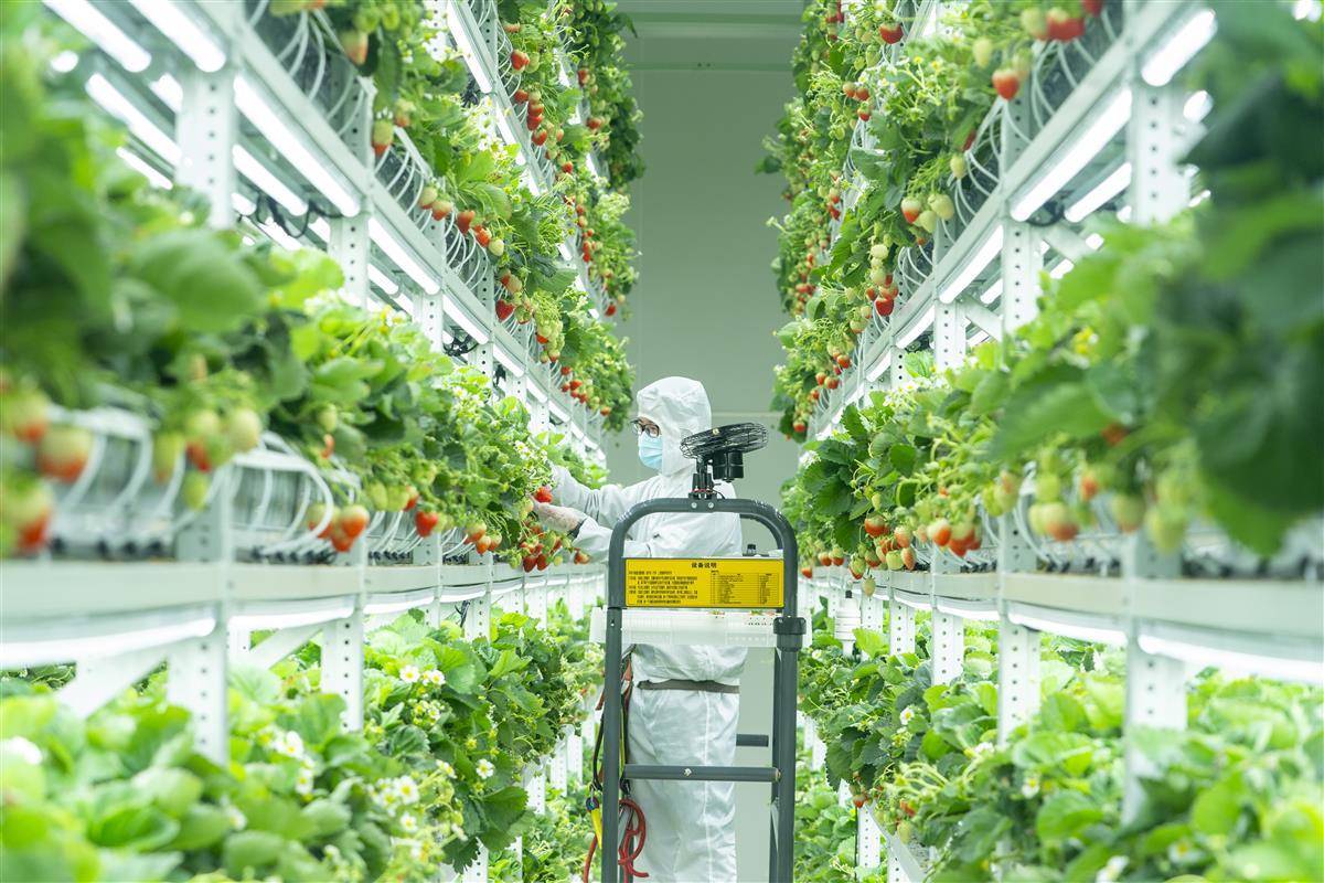 2025年12月26日,位于光谷花山的植物方舟草莓基地,200平方米的草莓垂直种植标准间,工作人员在8层立体栽培架间穿梭采摘。科研人员依托全闭环智能管理平台,实时监测植株生长状态,辅以可调光谱植物生长灯,模拟草莓最佳光周期,自动调节水肥配方,实现氮、磷、钾及中微量元素的精准供应。通过长达90天的自然生长周期与全程集中养分供给,最终培育出单果超过50克的优质草莓,远超普通草莓大小。目前,该基地建有约2000平方米的智能环境模拟室,形成了从人工光植物工厂、自动化生产线到种苗繁育与育种加速器的全链条工业化种植体系。(湖北日报全媒记者 魏铼 摄)