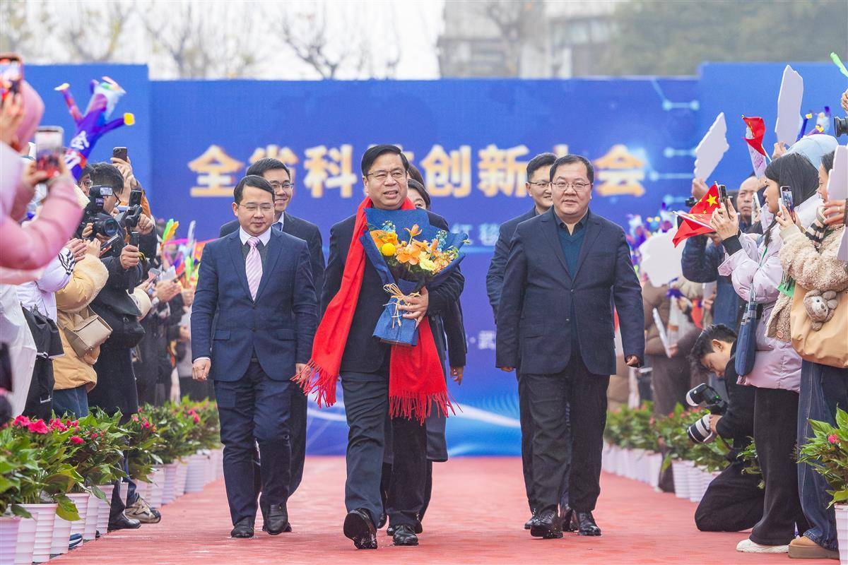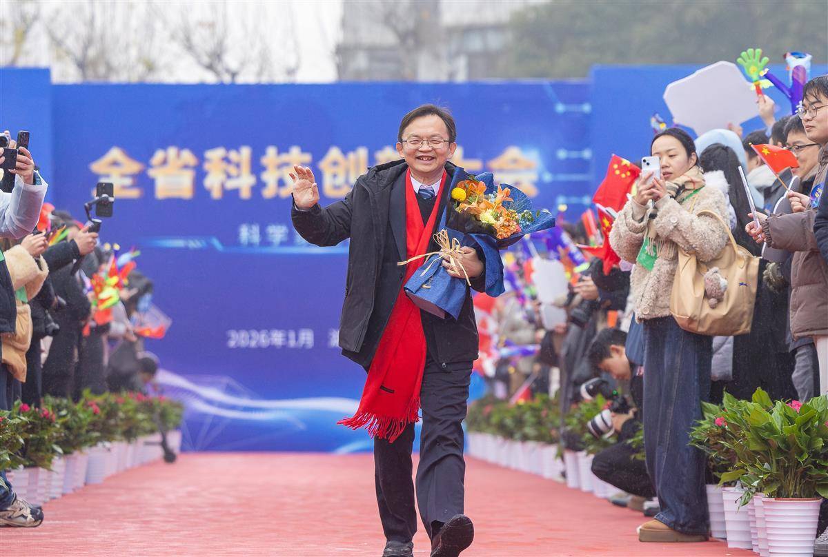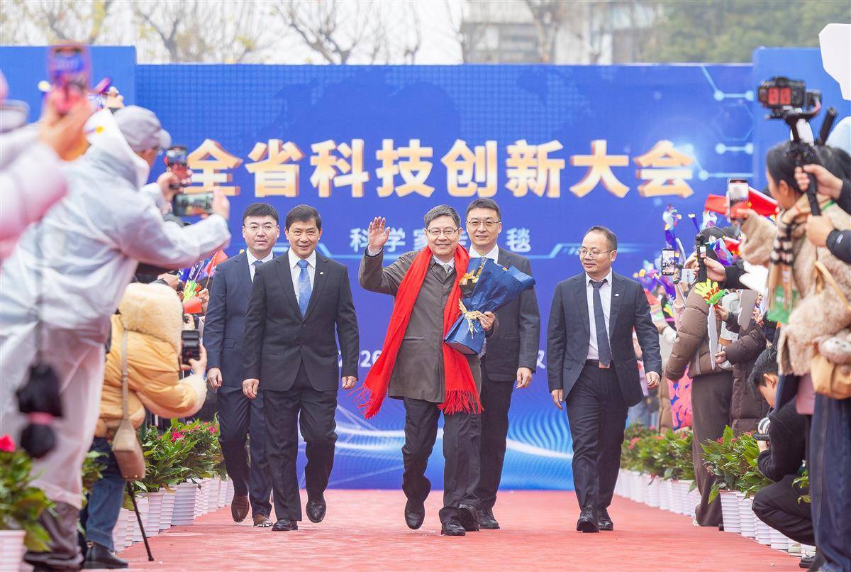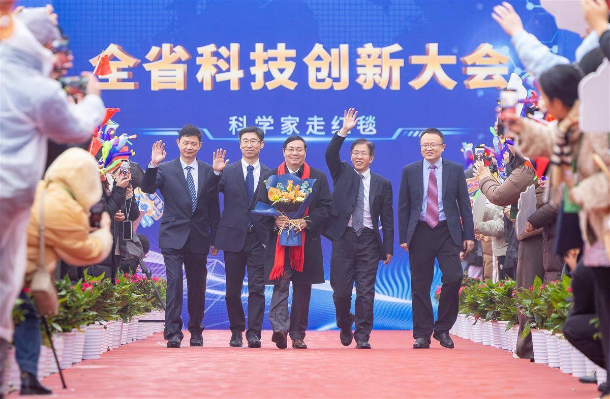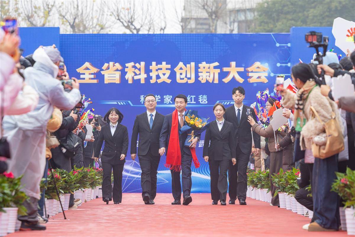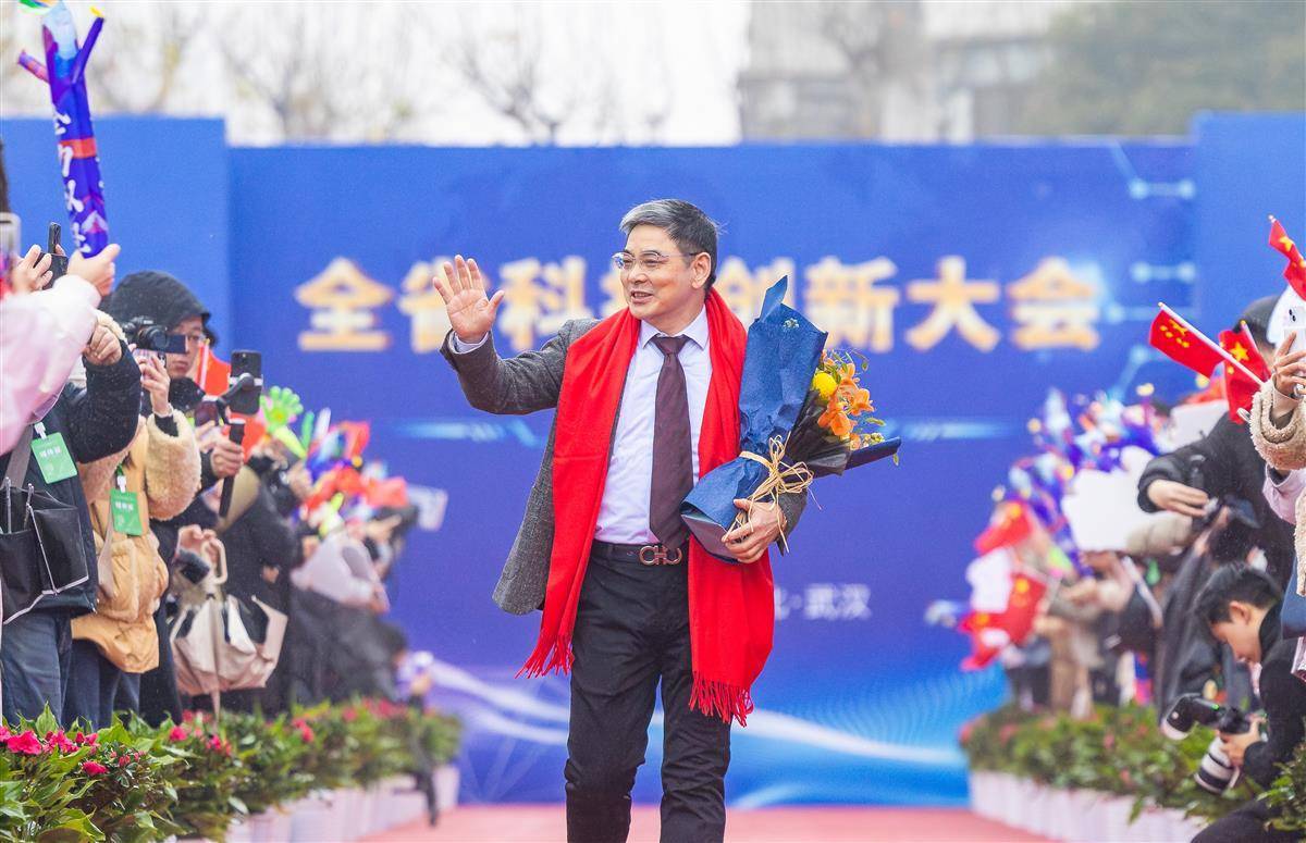 1月4日,全省科技创新大会在武汉洪山礼堂召开。礼堂外,铺就百米红毯迎接我省科技“巨星”登场,从幕后走向前台。在两侧由中小学生、青年科技工作者等组成的“粉丝团”的欢呼声和掌声中,12位科学家依次走上红毯,走向属于他们的闪耀时刻。(湖北日报全媒记者 柯皓 摄)