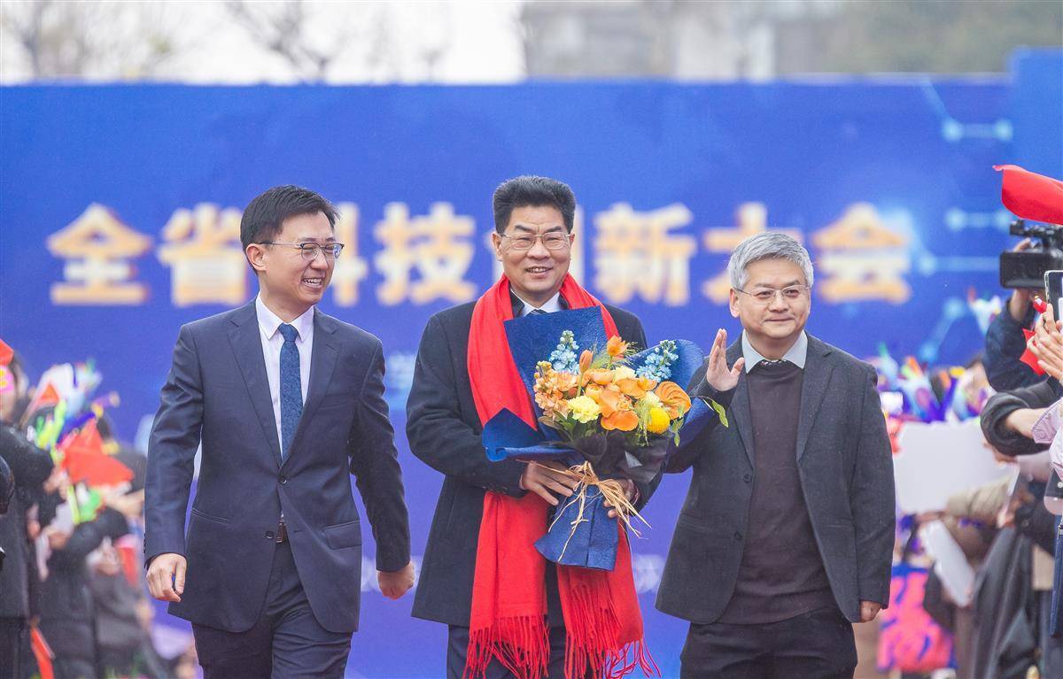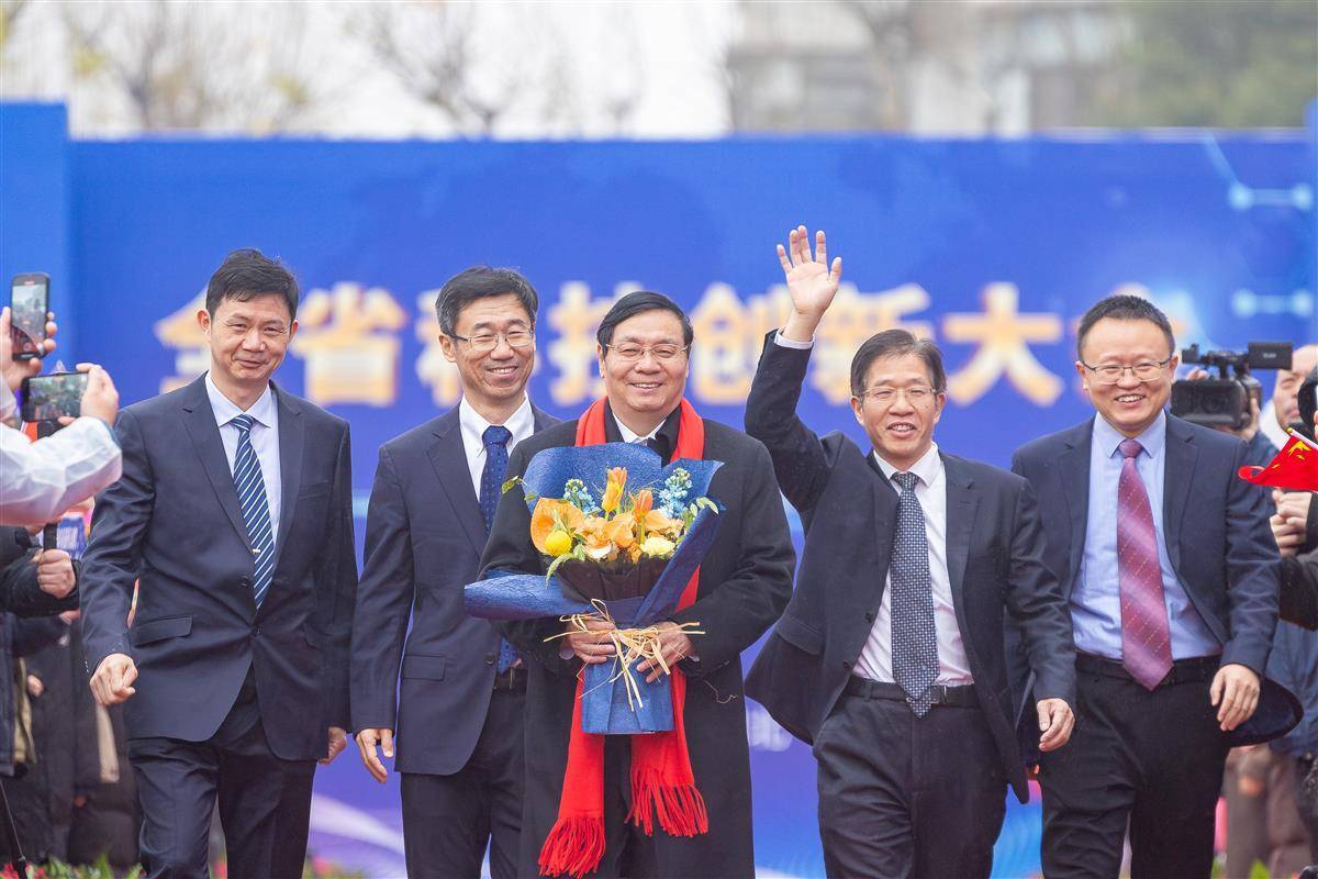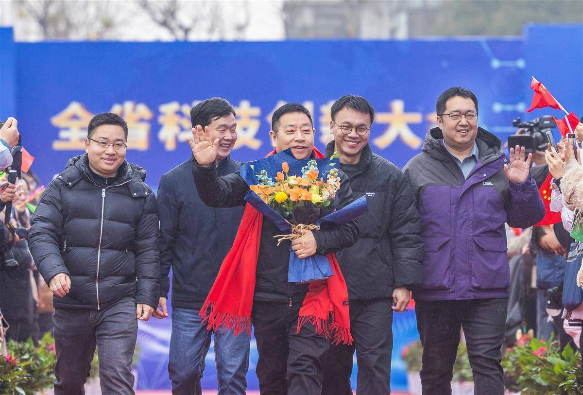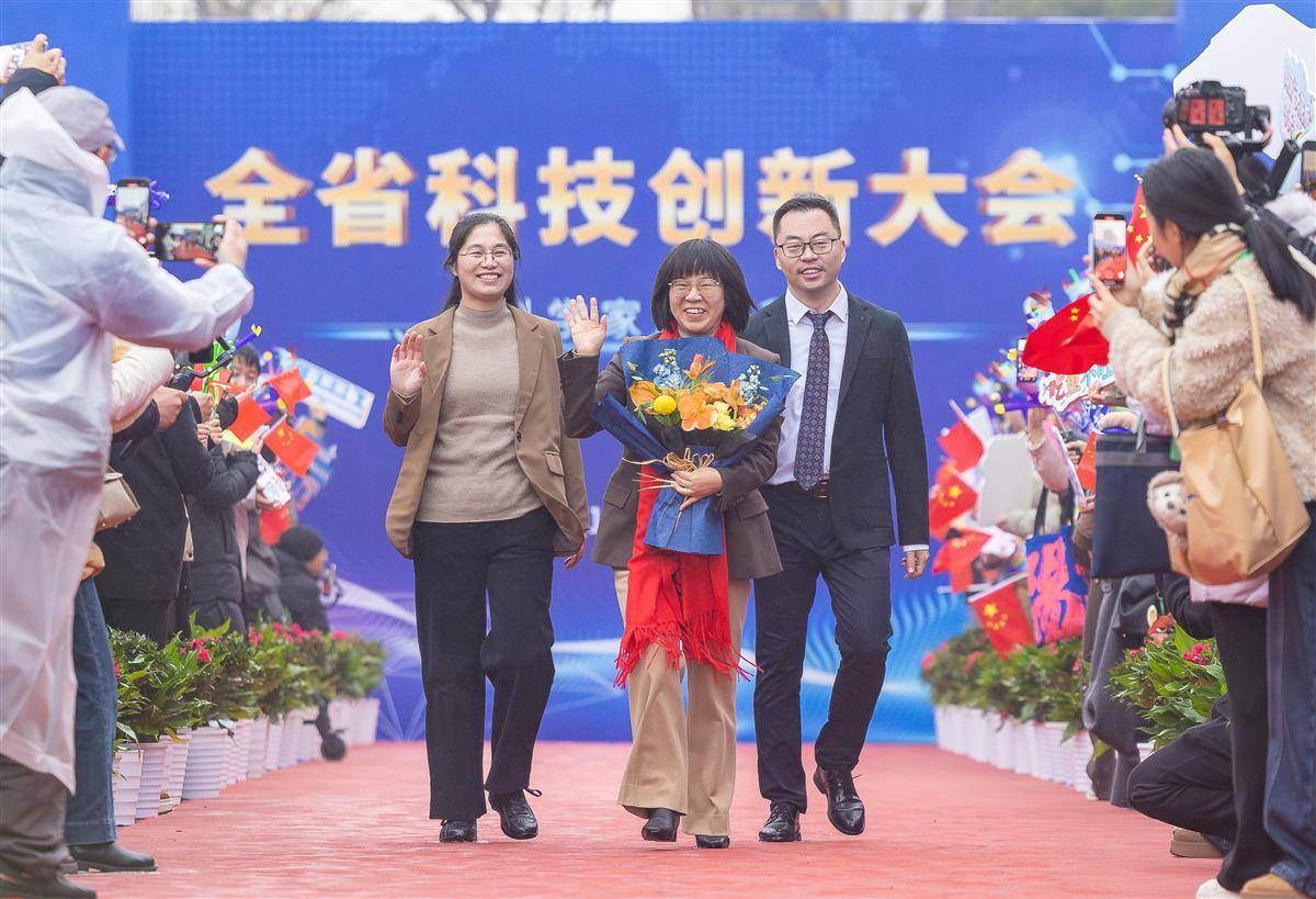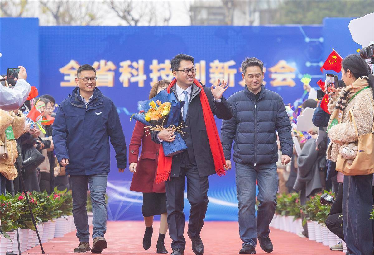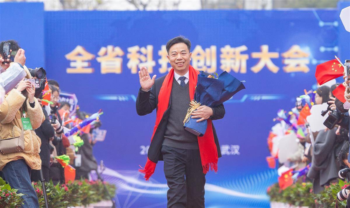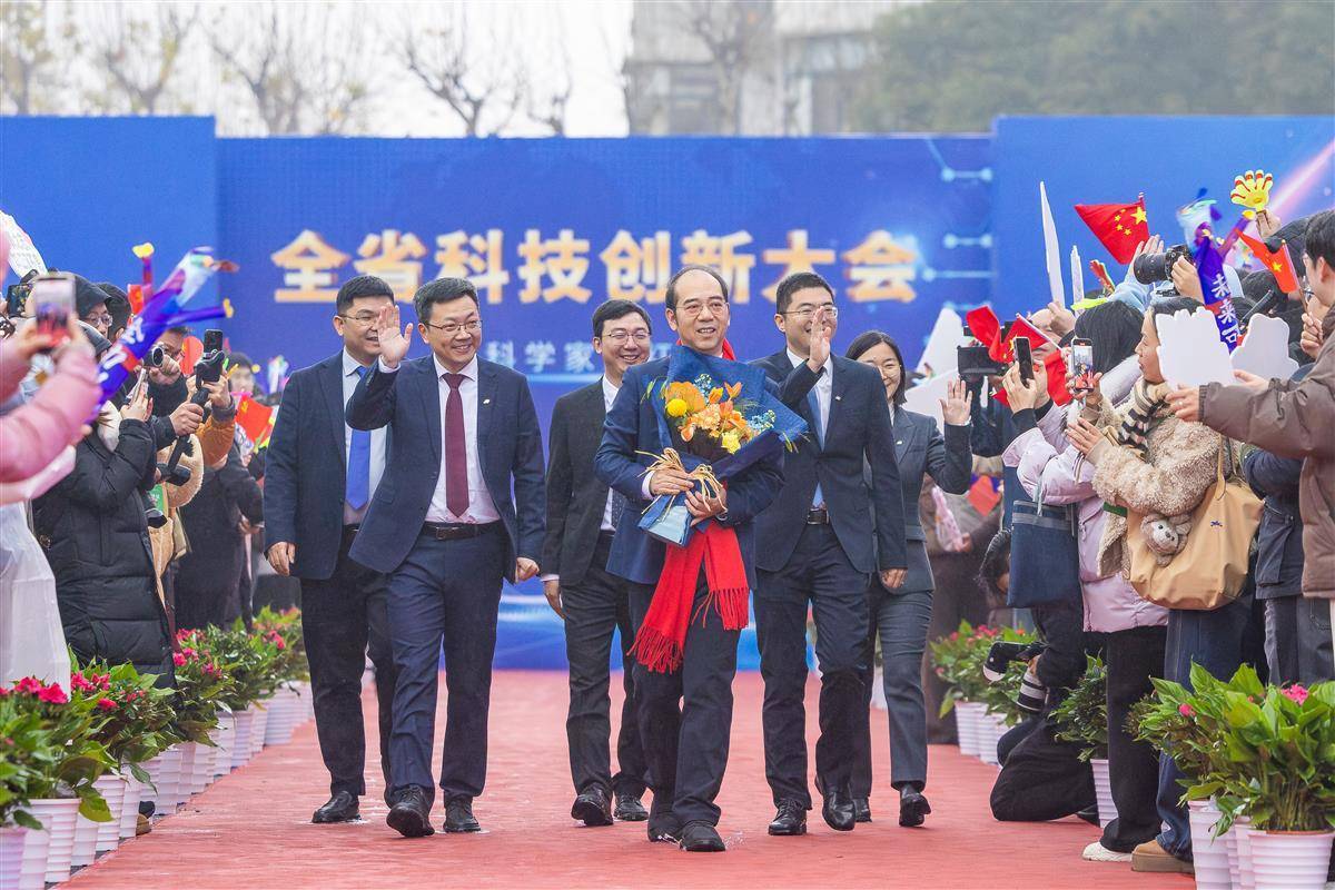 1月4日,全省科技创新大会在武汉洪山礼堂召开。礼堂外,铺就百米红毯迎接我省科技“巨星”登场,从幕后走向前台。在两侧由中小学生、青年科技工作者等组成的“粉丝团”的欢呼声和掌声中,12位科学家依次走上红毯,走向属于他们的闪耀时刻。(湖北日报全媒记者 柯皓 摄)