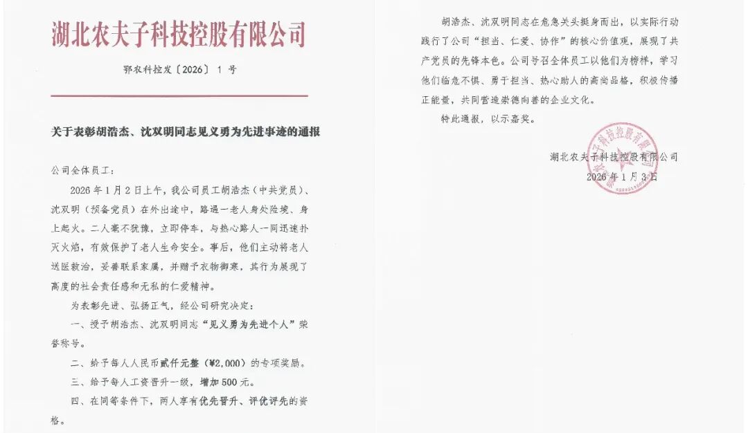 1月3日,孝昌梦里花园联合社通过网上的报道得知了他们的事迹后,立即对两人进行了表彰,肯定了他们见义勇为的行为。