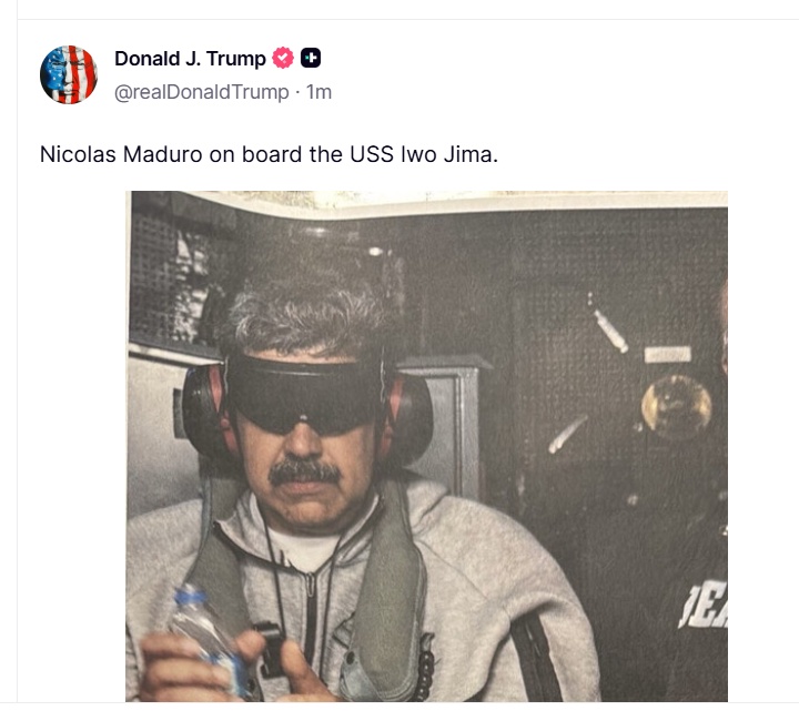 特朗普在社交媒体发布马杜罗在美军舰上戴手铐、双眼被蒙住的照片