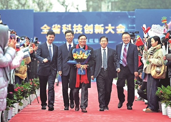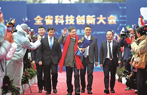 1月4日,湖北省科技创新大会在武汉举行,科学家们走过红毯进入会场。会上宣读了省政府关于2025年度湖北省科学技术奖励的决定,授予312项(人)科学技术奖励。其中,武汉大学龚健雅院士(左图右二)和华中科技大学丁烈云院士(右图右二)获科学技术突出贡献奖。楚天都市报极目新闻记者肖颢摄