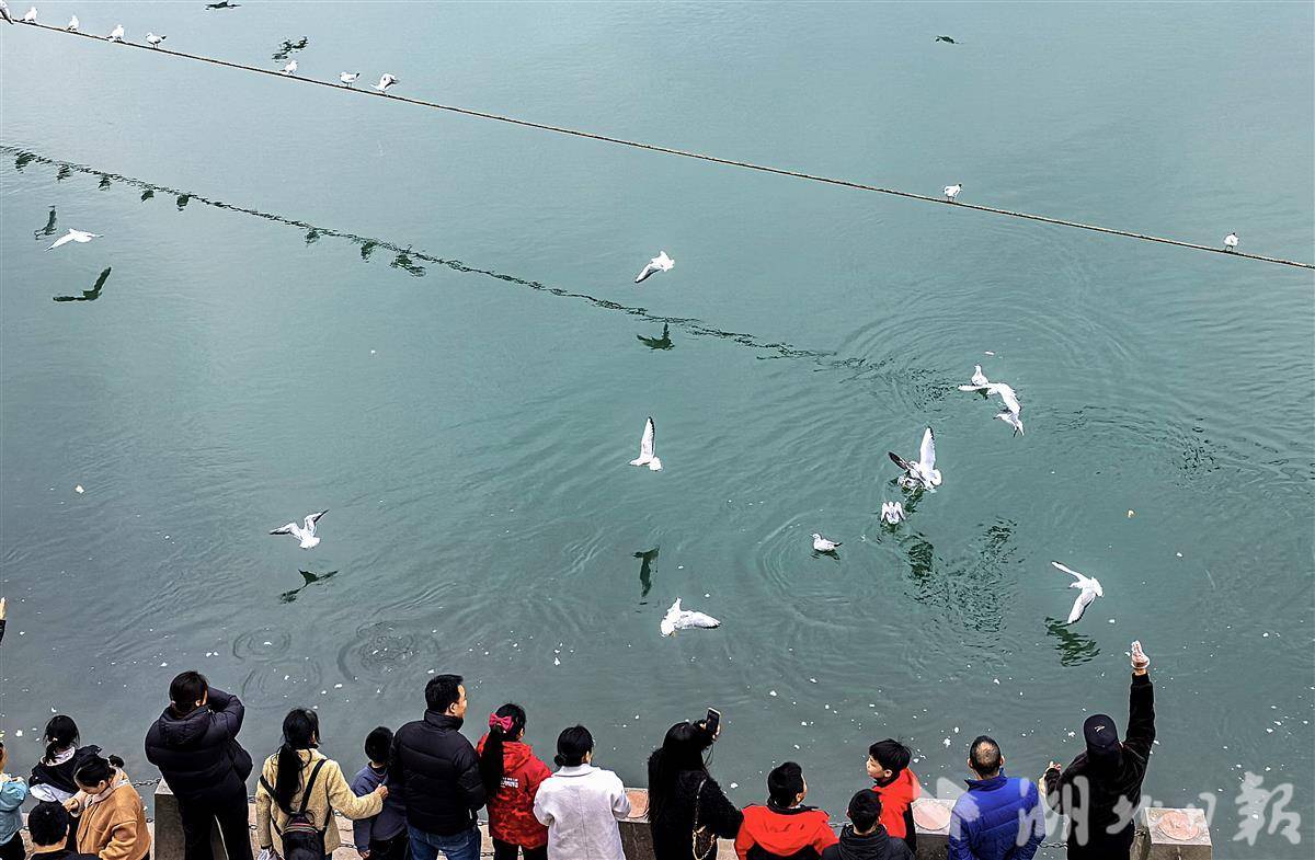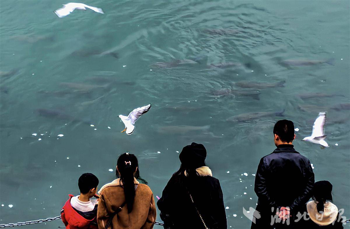 12月6日,在四川省宜宾市合江门广场上,金沙江、岷江、长江交汇处的三江口,聚集了大量市民游客,有的人带着馒头等食物向江中抛撒,引来野生鱼群翻涌争夺。一幅人鱼共生的画卷展现在人们的眼前。