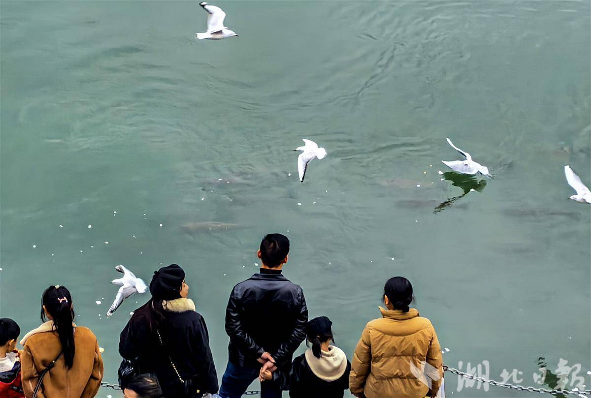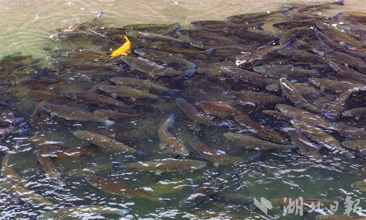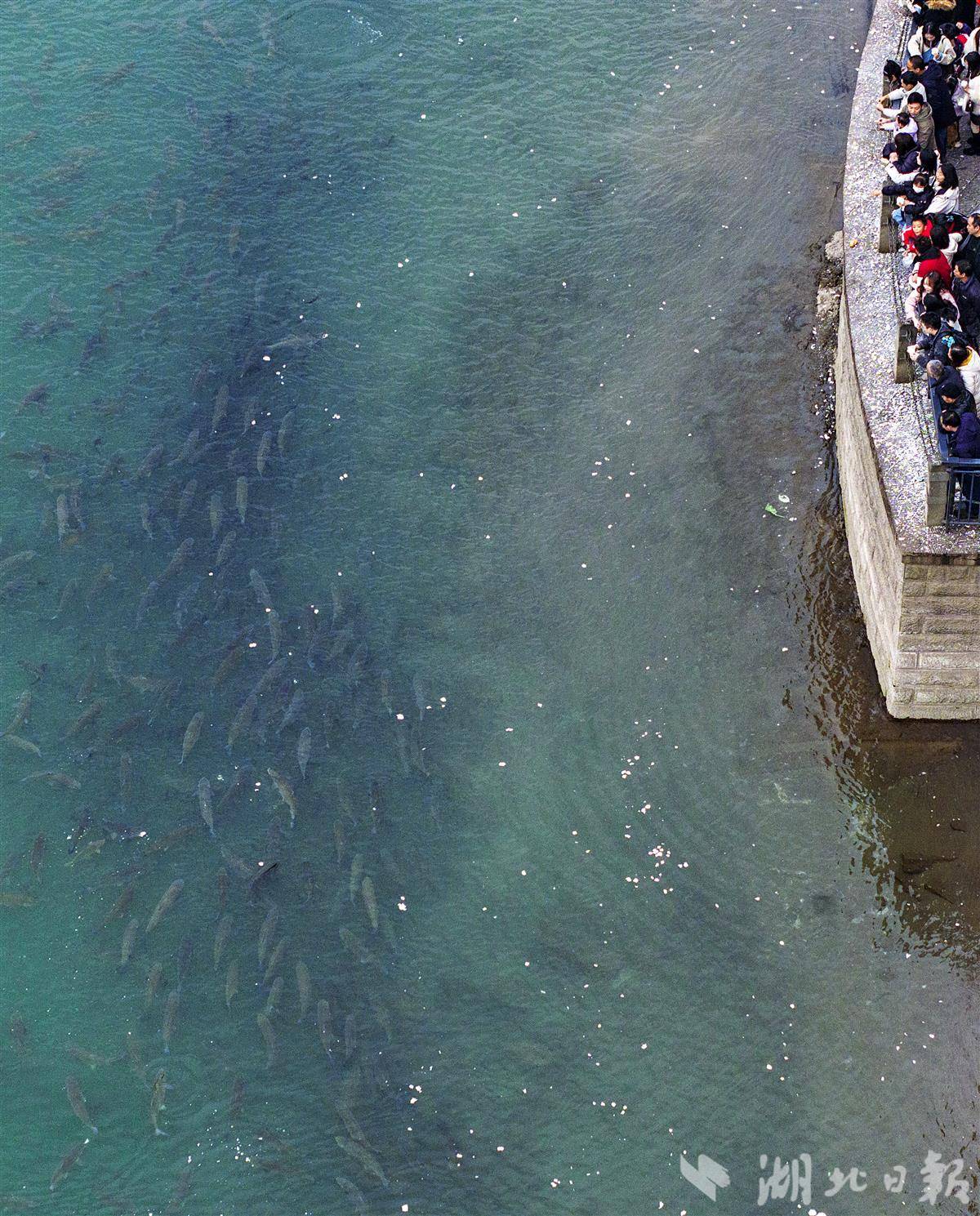 据了解,长江十年禁渔政策+人工增殖放流+市民持续投喂,共同促成了宜宾三江口野生鱼群大量聚集并亲近人类,形成“人鱼互动”的独特生态景观,使野生鱼在事实上被“宠成”了类似公园观赏鱼的存在。当江水进入枯水期后,水质逐渐清澈,鱼类的“能见度”更高了。(湖北日报全媒记者 朱熙勇 摄)