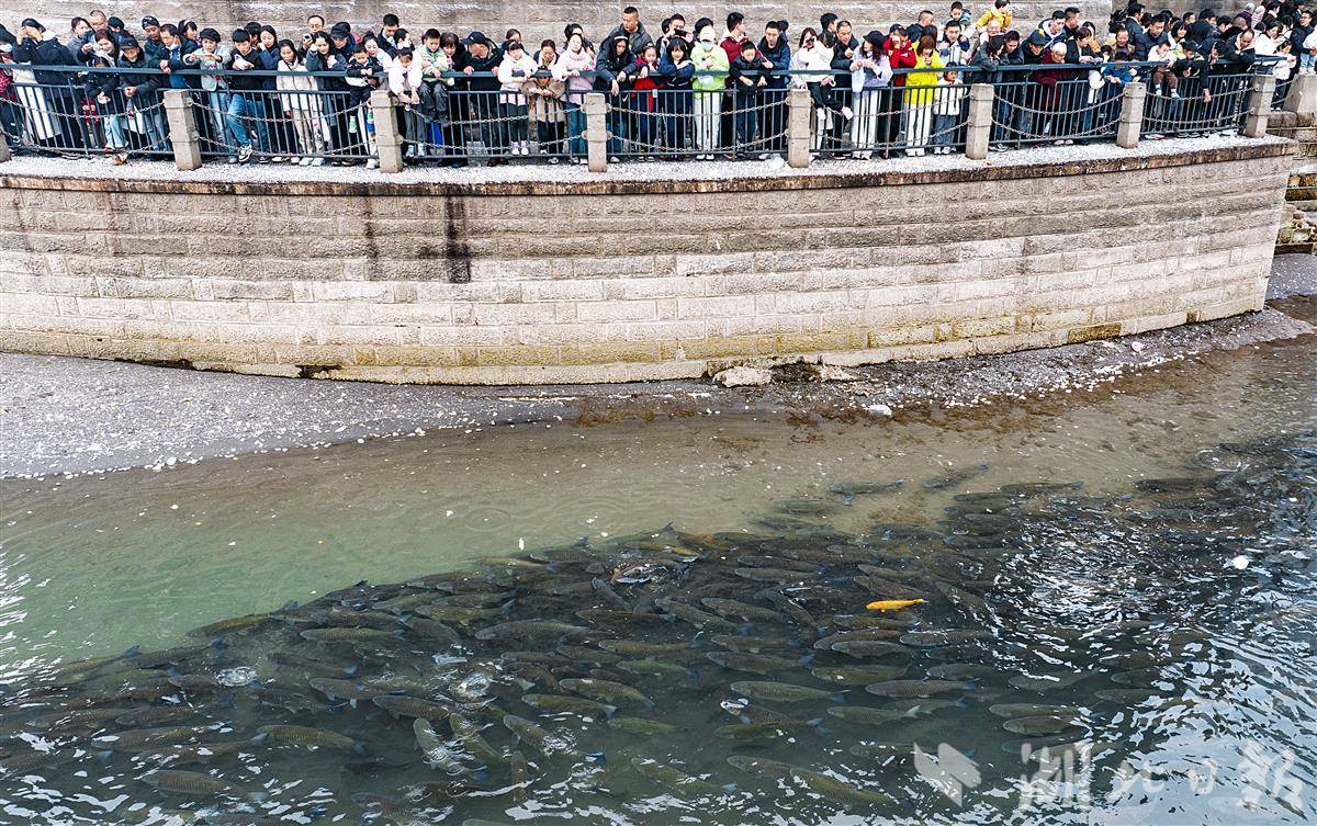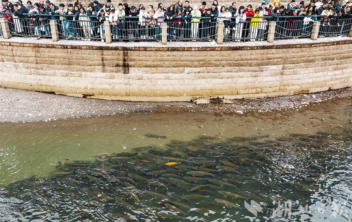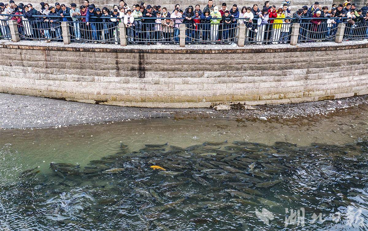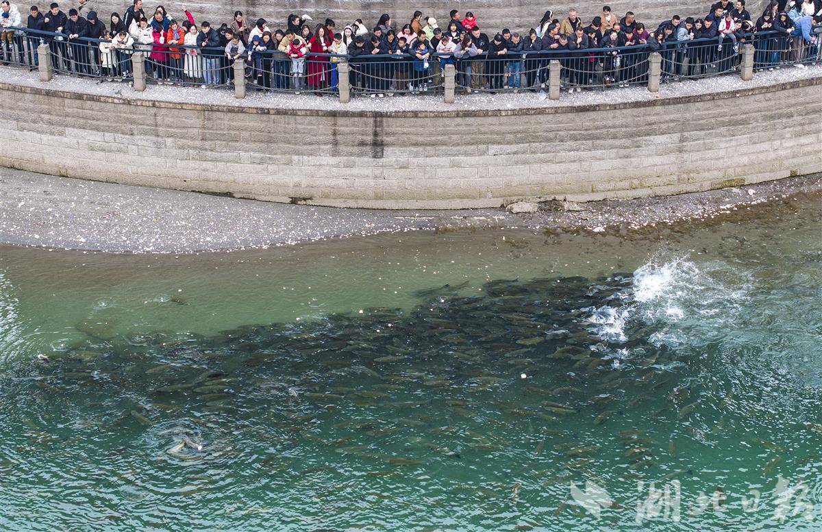据了解,长江十年禁渔政策+人工增殖放流+市民持续投喂,共同促成了宜宾三江口野生鱼群大量聚集并亲近人类,形成“人鱼互动”的独特生态景观,使野生鱼在事实上被“宠成”了类似公园观赏鱼的存在。当江水进入枯水期后,水质逐渐清澈,鱼类的“能见度”更高了。(湖北日报全媒记者 朱熙勇 摄)
