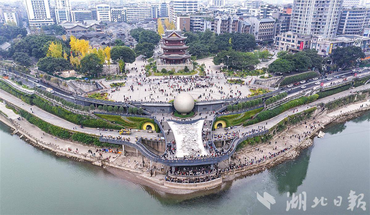 四川省宜宾市合江门广场三江口的人、鱼、鸟和谐共生。