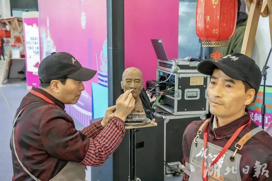 展览现场,设置了28个展销摊位,来自武汉、宜昌、鄂州、黄冈、孝感、襄阳、黄石、恩施等地的能工巧匠在现场展示并销售特色文创产品。入口处泥塑大师胡作林逼真的肖像雕塑,成为备受游客喜爱的打卡点。对工匠们精湛的技艺和作品丰富的文化内涵,引来观者赞叹连连。