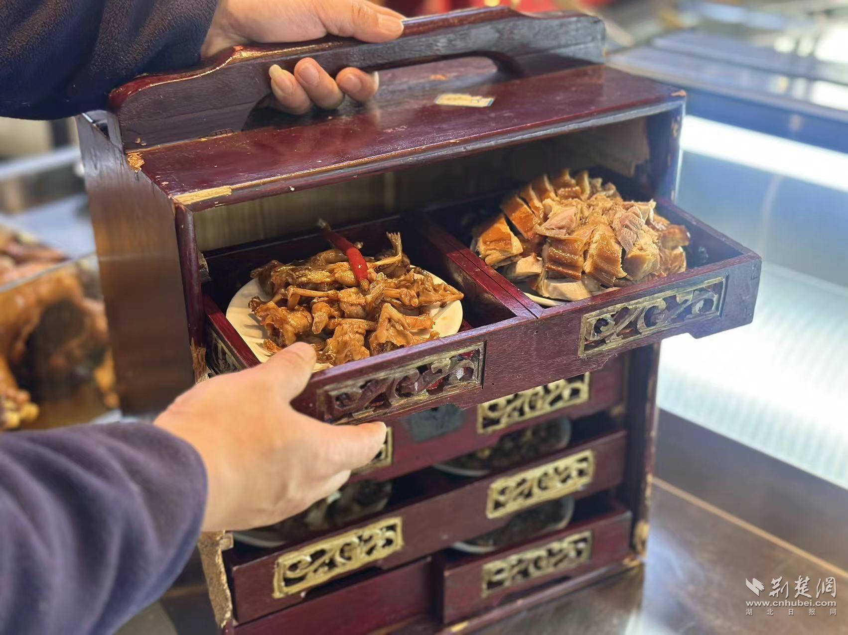 在“监利早酒”品牌店,邹艳梅正忙着招呼客人。红漆木制的“酌盒”打开,九宫格内,酱色的牛肉、油亮的卤顺风……9样精巧小菜琳琅满目。