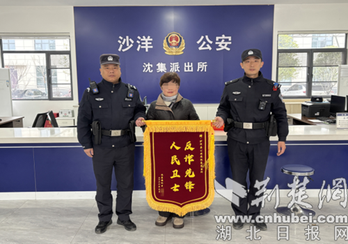 荆楚网(湖北日报网)讯(通讯员 姚薇 刘璠)2026年1月5日10时许,沙洋县沈集镇居民聂女士将一面印有“反诈先锋 人民卫士”的锦旗送到沙洋县公安局沈集派出所民警手中,感谢民警成功为其挽损1.3万元被骗资金。