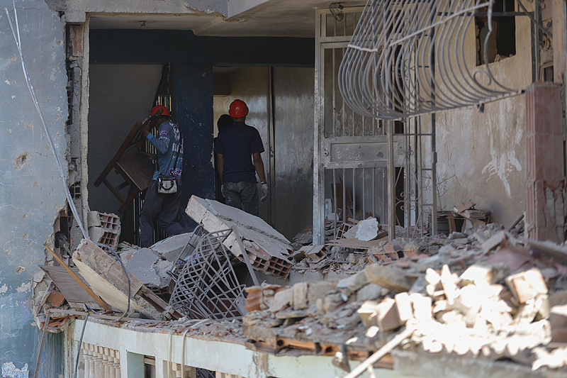 △当地时间1月5日,委内瑞拉拉瓜伊拉市,工人们正在清理一栋公寓楼的废墟。居民称,这栋公寓楼在3日的美国军事行动中受损。