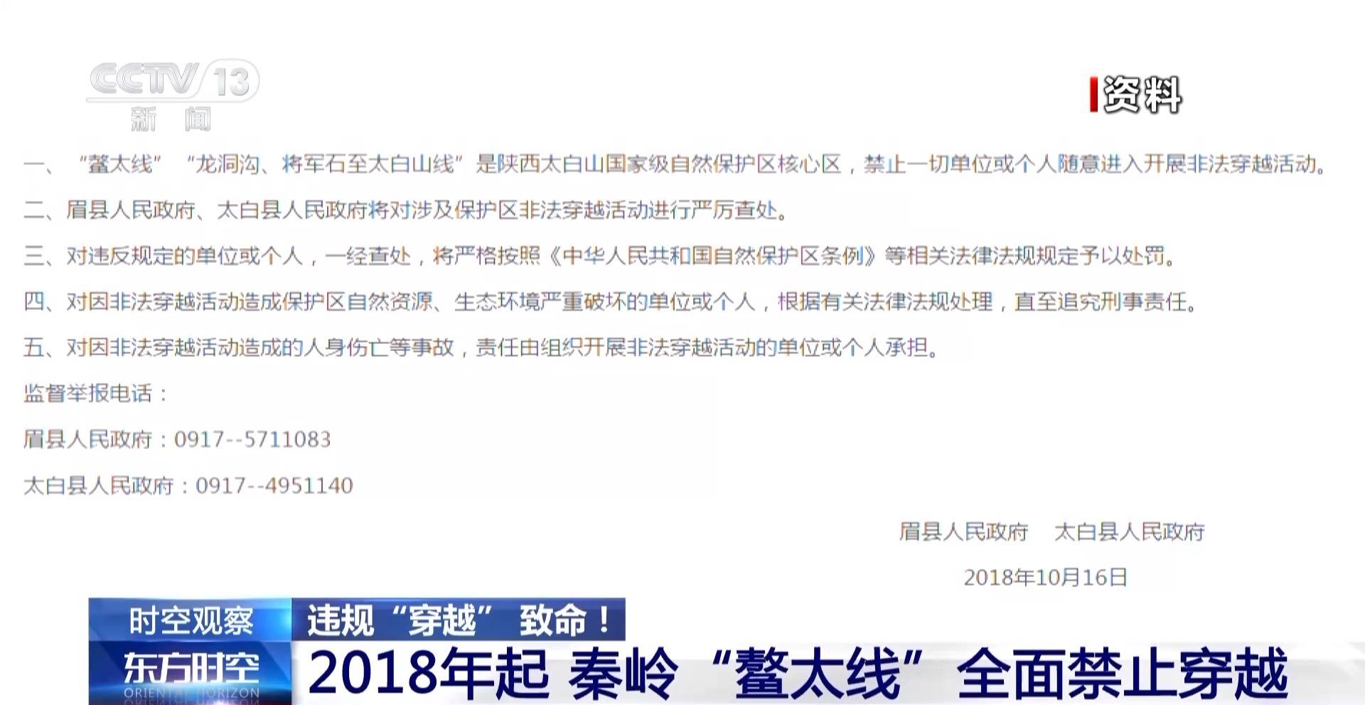 2018年,陕西省眉县和太白县人民政府联合发布公告,禁止非法穿越“鳌太线”。