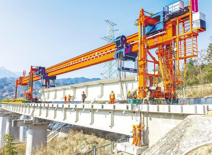 1月7日,中铁三局建设者在秭归县茅坪镇三峡枢纽茅坪港疏港铁路九里特大桥进行T梁架设作业。当日,随着最后一片T梁精准落位,九里特大桥顺利完成T梁架设任务,标志着该工程建设正式进入收尾阶段。三峡枢纽茅坪港疏港铁路自宜万铁路宜昌南站西端起至秭归县茅坪港,建成通车后,将形成无缝衔接、装卸一体的“铁水联运”模式,进一步完善长江三峡综合交通运输体系。(视界网 王罡 王志垚 摄)