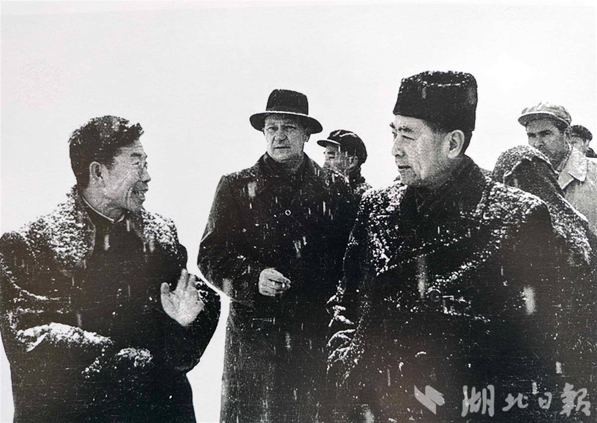 1958年2月底周恩来冒着大雪考察荆江大堤。(湖北日报记者 张其军 摄)