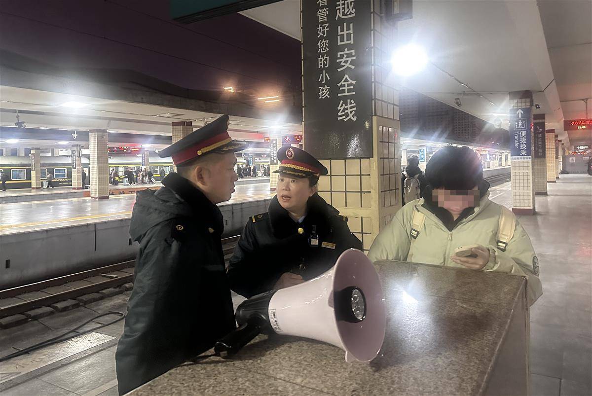 列车长李隆萍陪伴在女孩到达长沙站站台。