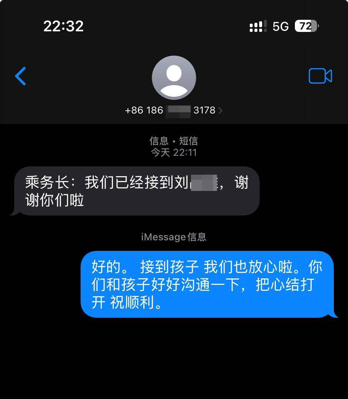 列车抵达长沙站后,李隆萍亲自将女孩交到车站值班员手中,并再次温柔安抚,确保交接过程安全稳妥。当晚10点半,已经接到女孩的家人给李隆萍发来短信,再次表示感谢。