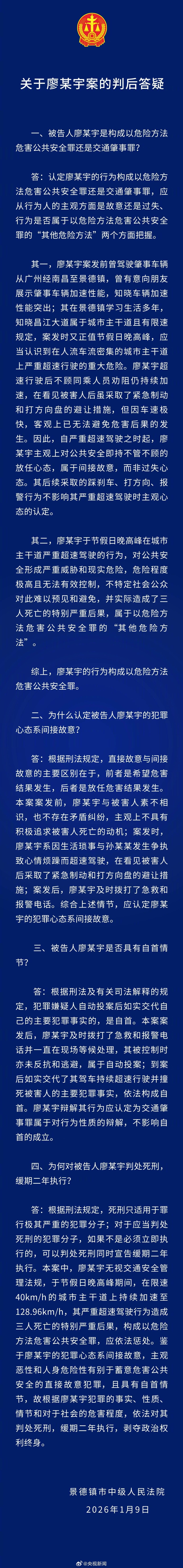 同日,景德镇市中级人民法院发布关于廖某宇案的判后答疑↓
