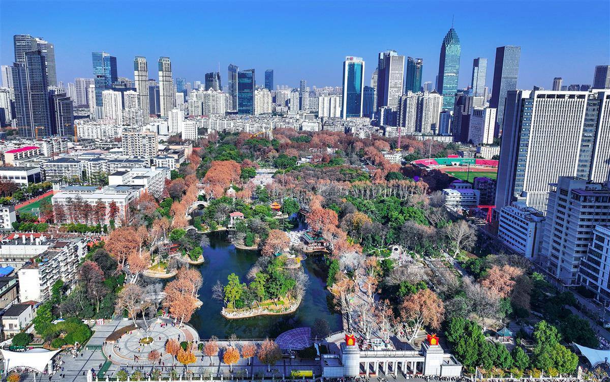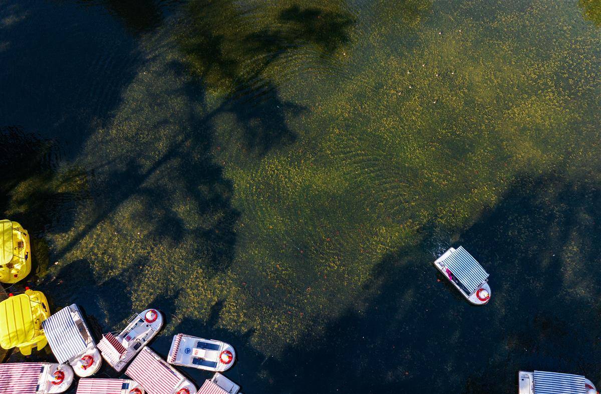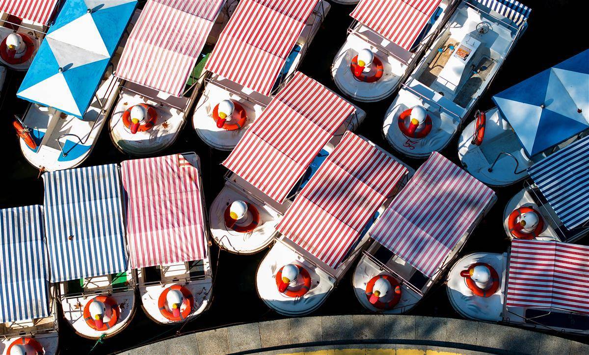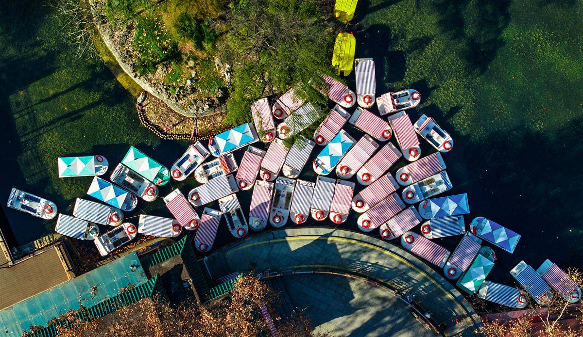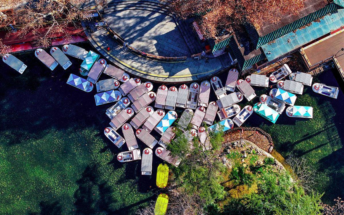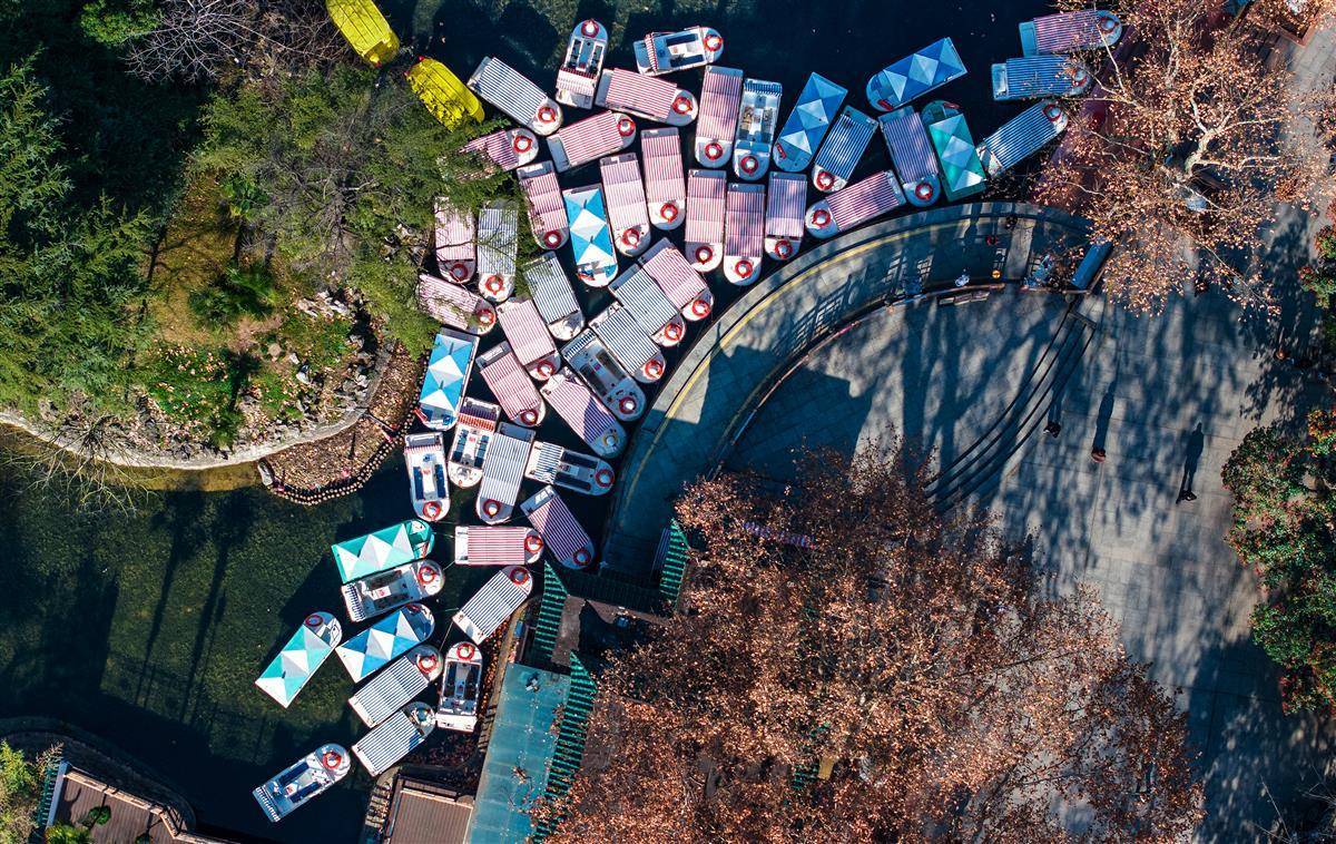1月8日,鸟瞰武汉中山公园里的游船码头,数十艘船聚集,好像拼方块一样“拼出”一幅美丽图案。隐藏在繁华都市之中的中山公园,以其独有的静谧与美丽,吸引了众多市民前来游玩。(湖北日报全媒记者 朱熙勇 摄)