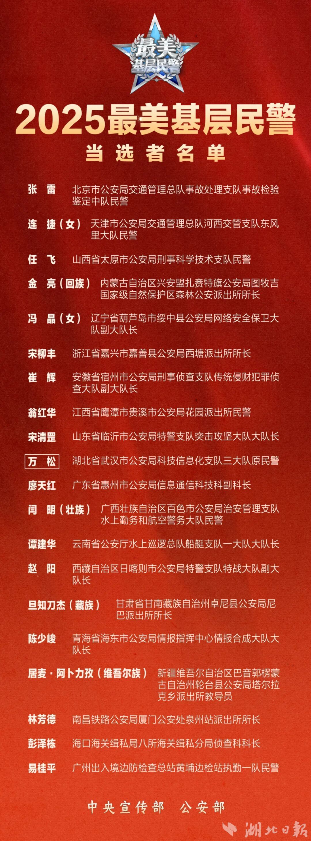 湖北日报讯(记者杨然)1月9日,在第六个中国人民警察节来临之际,中央宣传部、公安部向全社会发布“最美基层民警”。武汉市因公牺牲民警万松等全国各地20名同志光荣入选。