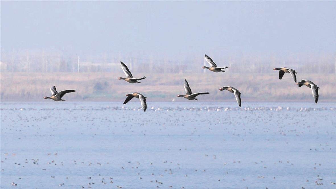 在沉湖湿地自由飞行的灰雁小分队 通讯员颜军摄