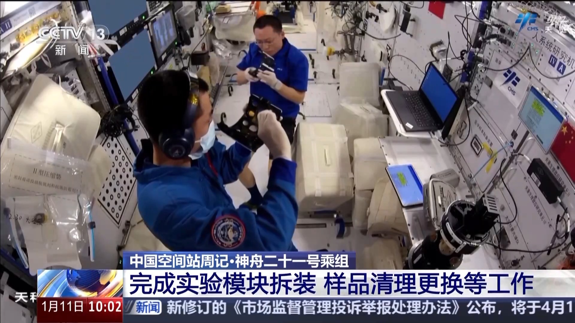 根据实验安排,乘组完成了燃烧科学实验柜内燃烧器更换、流体物理实验柜内实验模块拆装,以及无容器柜实验腔体样品清理,实验样品更换,轴心机构电极维护、视窗盖镜片清洁与更换等工作。