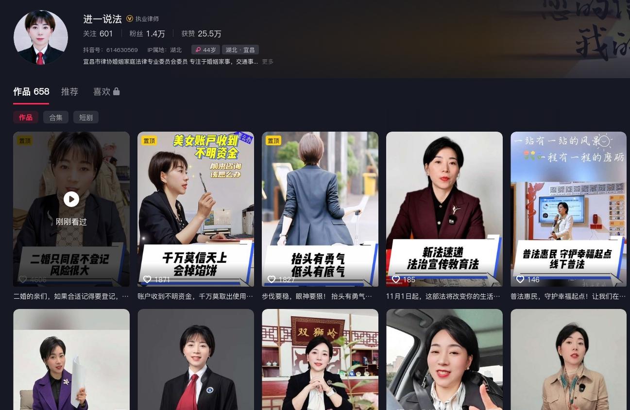 “进一说法”聚焦群众日常生活中“急难愁盼”的法律问题,设置“案例解读”“剧情演绎”“律师答疑”等板块。一段段几分钟的视频,把复杂的法律条文变成身边的故事,把生硬的规定讲成通俗的道理。视频节奏轻快、语言生动,配上字幕和音效,让人看得进、记得住。自开设以来,已累计发布普法短视频650余条,播放量突破400万人次,收获点赞25.5万。