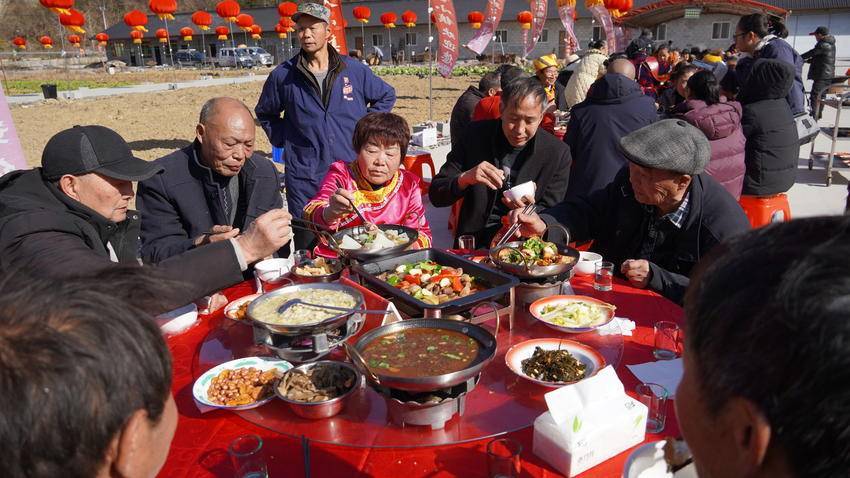 院子内,圆桌整齐排列,刚出锅的五花肉、鲜香的猪血汤、醇厚的烟熏腊肉等特色菜品陆续上桌,热气腾腾的饭菜裹挟着浓郁的香气,瞬间唤醒味蕾。一家人围坐桌前,共享美食、闲话家常,温馨的画面在现场随处可见。