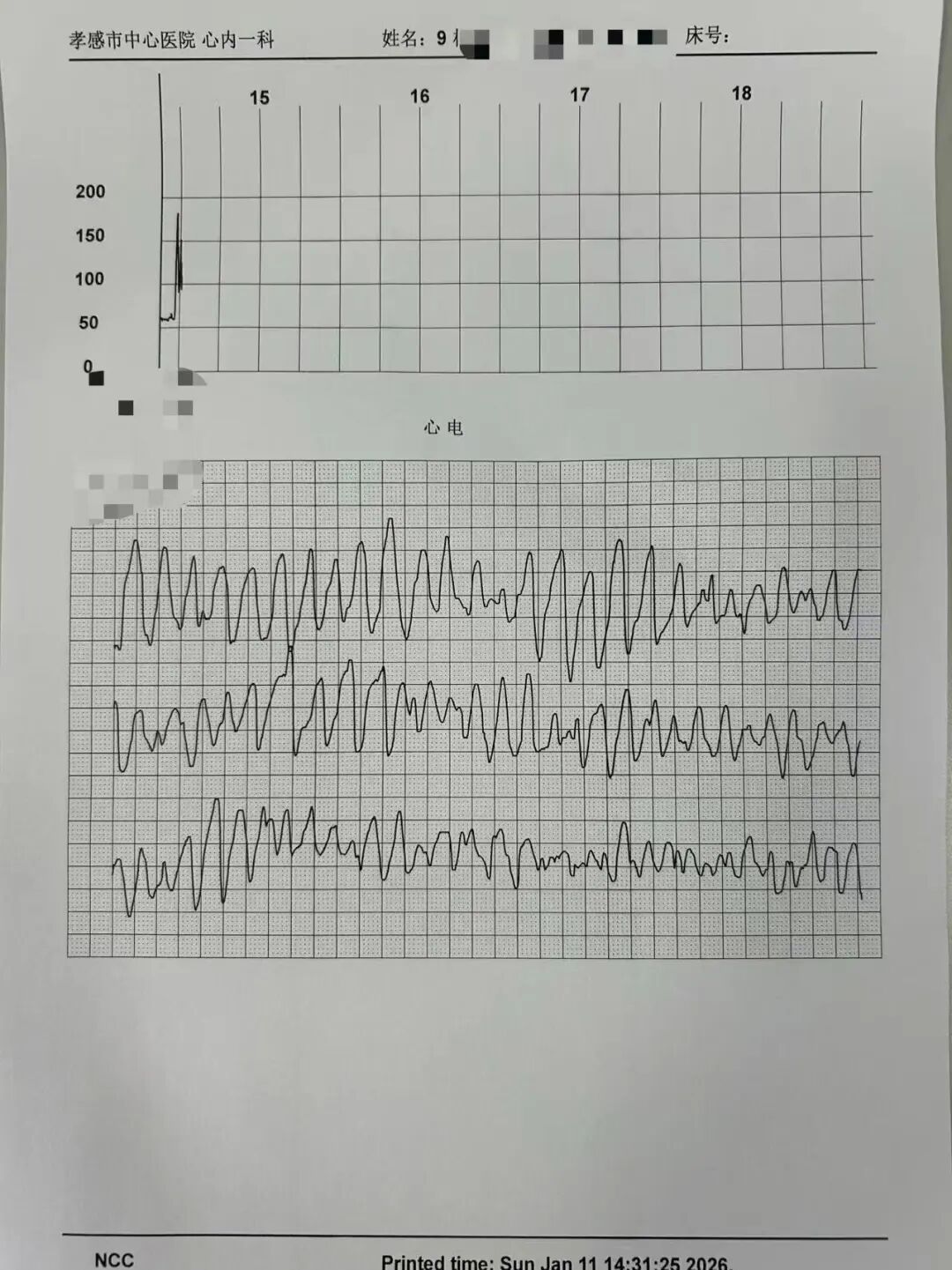荆楚网(湖北日报网)讯(通讯员 徐婷婷 刘芳 李文秀)2026年1月11日,孝感市中心医院心血管内科以快速识别、精准处置、高效协作的专业素养,在“黄金四分钟”内成功救治突发心室颤动(室颤)的80岁患者杨婆婆(化名),不仅以过硬专业实力筑牢心血管急危重症救治生命防线,更生动诠释了“时间就是生命”的急救理念。