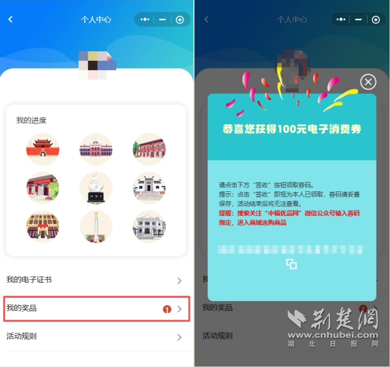 点击菜单栏“职工服务”,进入“服务大厅”;找到“趣味运动”入口,进入“个人中心-我的奖品”;点击“签收”按钮,即可看到券码信息,请一定妥善保存好券码信息!