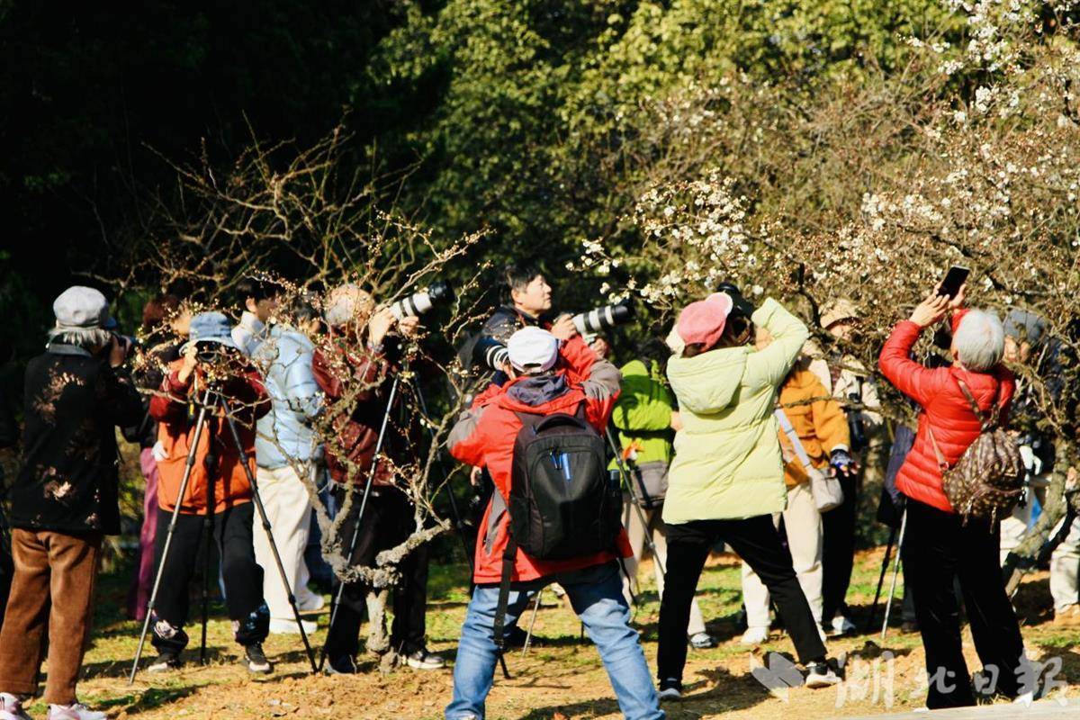 “早就听说龙游梅稀有,今天特意来打卡,枝干弯得太有韵味了,拍出来的照片自带古风滤镜!”本地摄影爱好者手持相机,对着一株龙游梅多角度拍摄,身旁不少游客或驻足观赏,或与花枝合影,欢声笑语萦绕梅林。据了解,因今年冬温偏暖,东湖梅园龙游梅花期较往年提早,目前正处于初绽阶段,单朵花期仅8天左右,短暂却惊艳,也让这份美景更显珍贵。