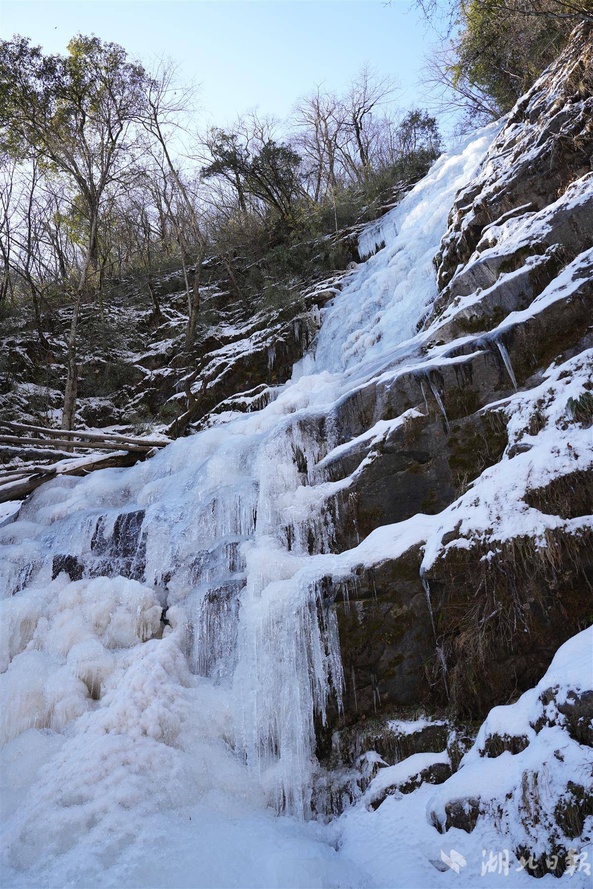 1月7日,海拔1200米的竹溪县营盘山生态旅游景区,气温零下8℃。湖北日报全媒记者穿上“冰爪”防滑鞋套,耗时约30分钟,登上了海拔1500米的冰瀑所在地。一路上,攀山步道被冰雪覆盖,山间溪流渐渐成冰。